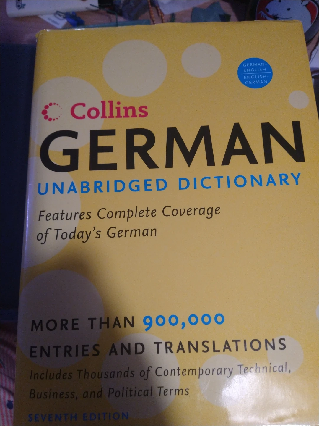 Selling a Collins German Unabridged Dictionary. This edition features complete coverage of today's German and includes thousands of contemporary technical, business, and political terms. A new look at language!