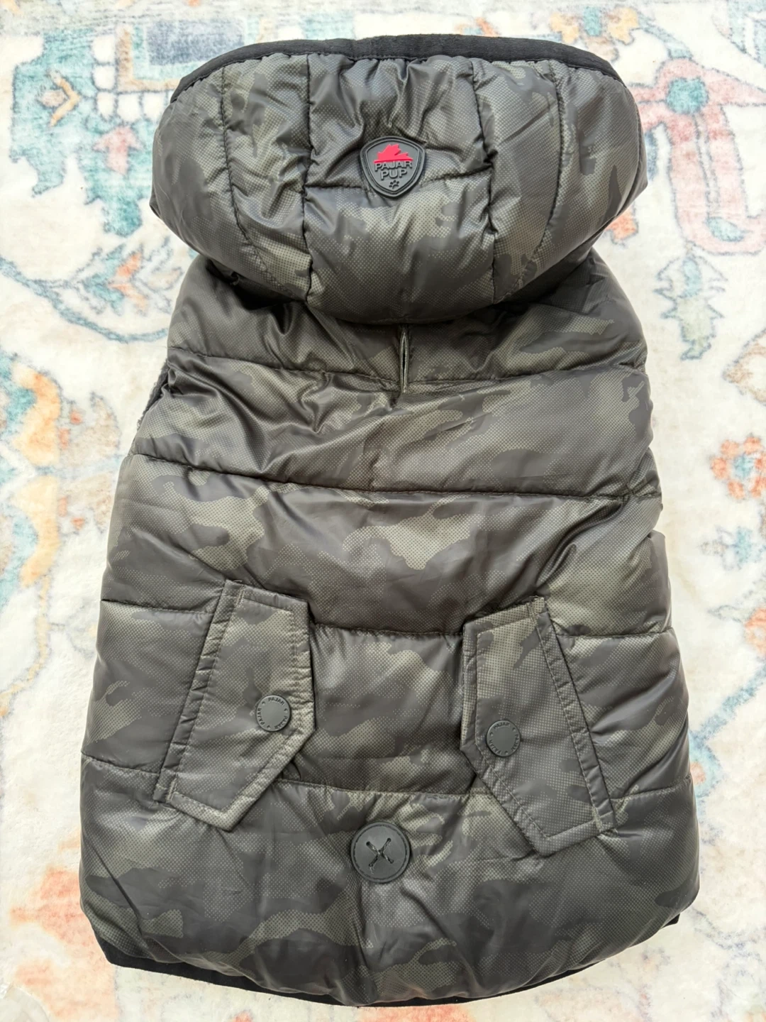 Keep your furry friend warm and stylish with this Pajar Pup puffer vest. It's perfect for those chilly Canadian walks. Reversible pattern - black and camo. Also has a handy pouch to keep poop bags. Size Medium.