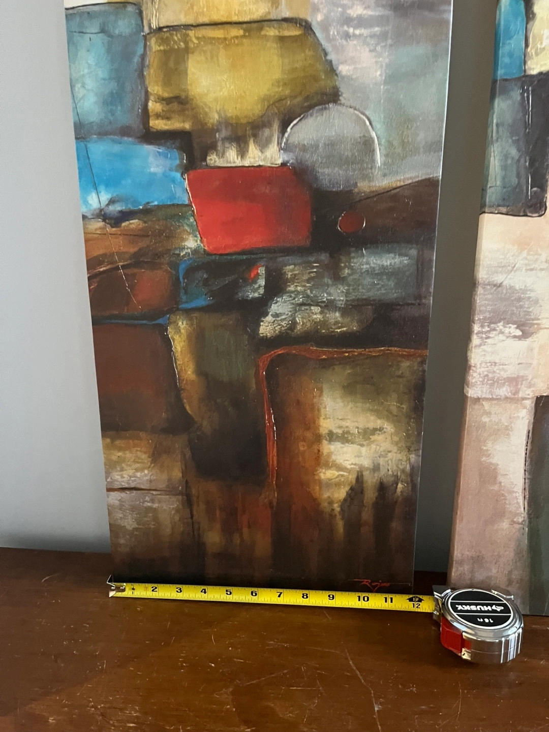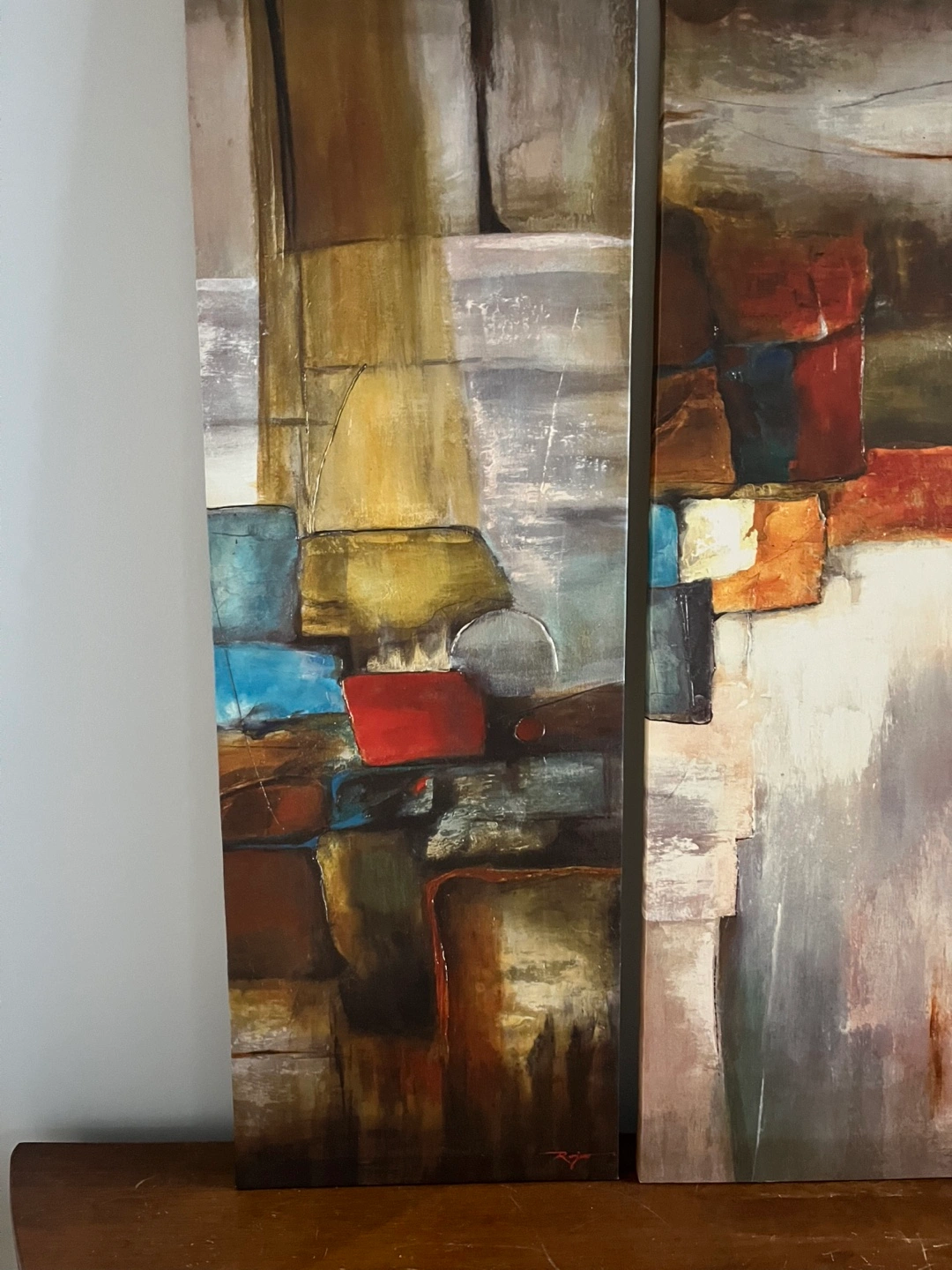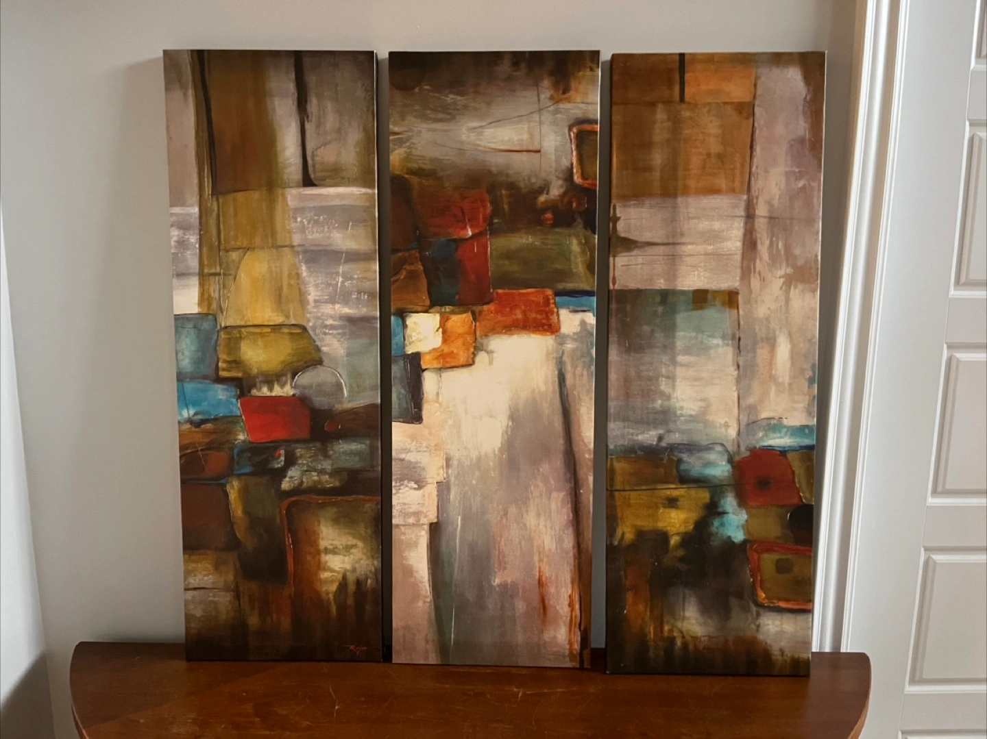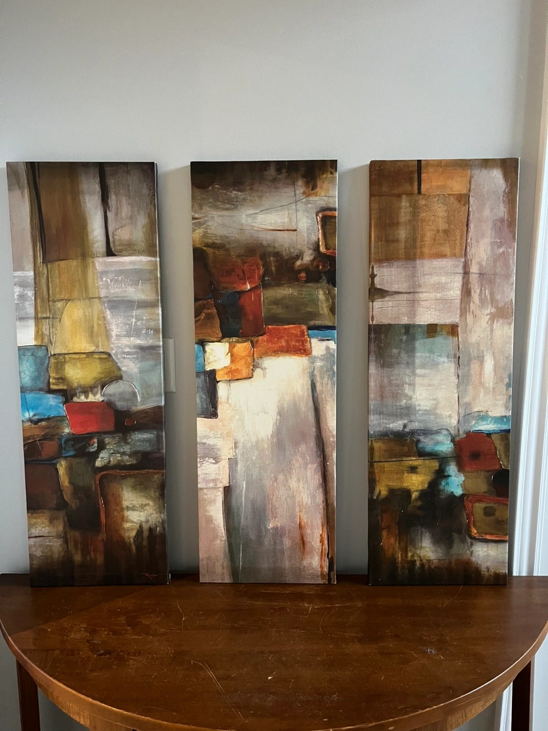 Selling a set of three canvas abstract wall art pieces! A mix of colours including browns, blues, reds, and yellows.