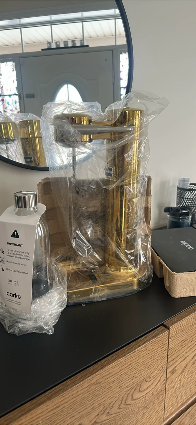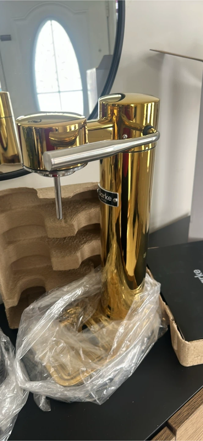 Selling a brand new Aarke Carbonator 3 in gold! It's still in its original packaging and has never been used. This sleek and stylish sparkling water maker will look great in your kitchen. Comes with the box and all original components. Enjoy fresh sparkling water at home!