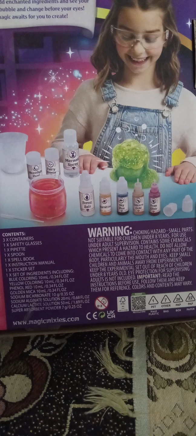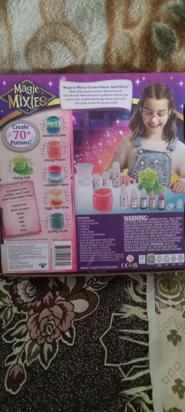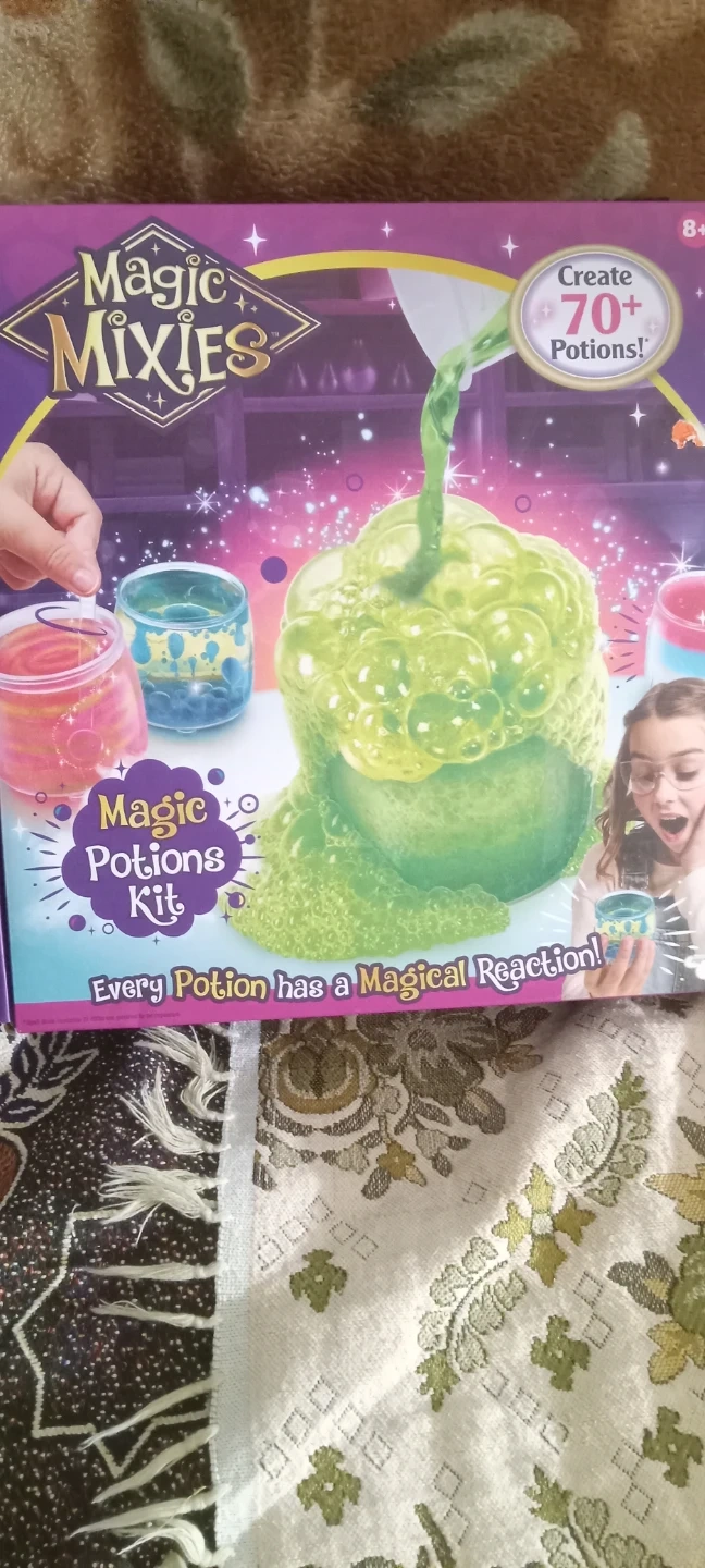 Create over 70+ potions with the Magic Mixies Magic Potions Kit! It's designed for ages 8 and up. The box includes containers, safety glasses, a pipette, a spoon, a spell book, an instruction manual, a sticker sheet, and a set of ingredients, including blue, yellow, red, and super absorbent powder