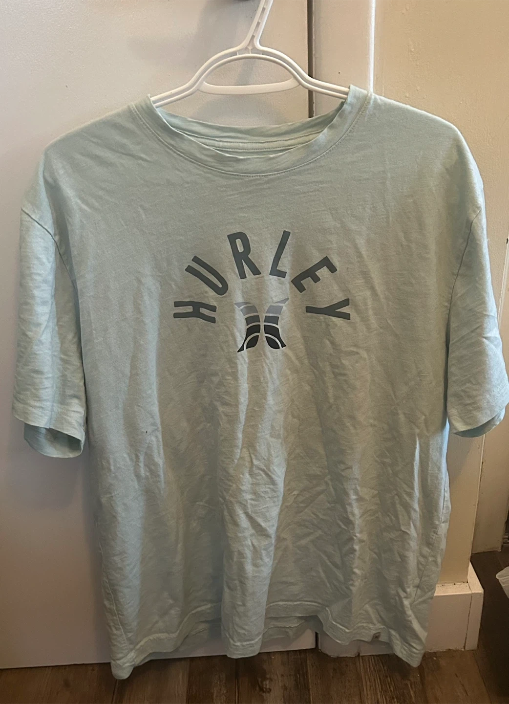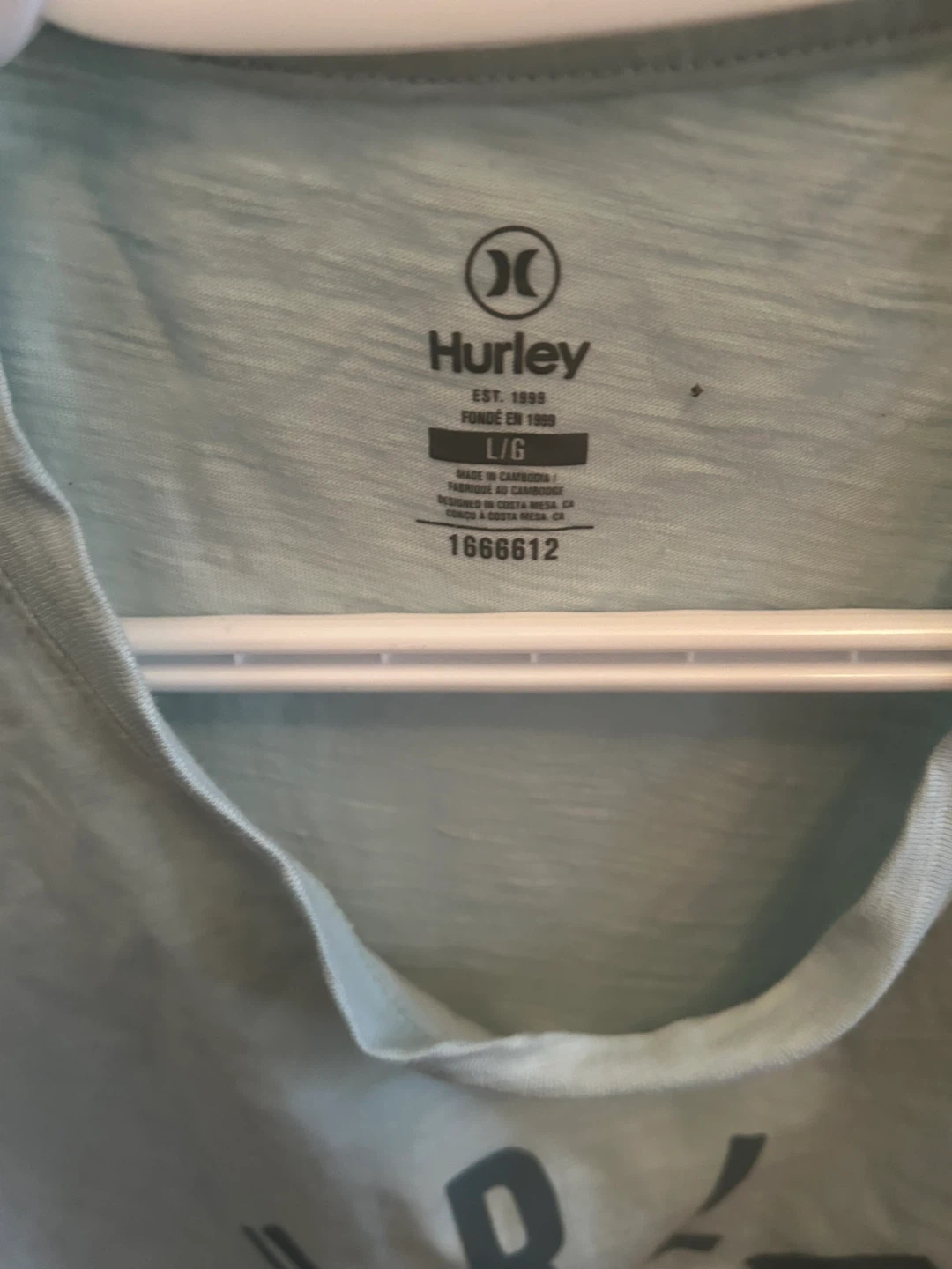 Selling a Hurley t-shirt in size large. It's in great condition and ready for a new owner! The shirt features the Hurley logo on the front. Perfect for casual wear