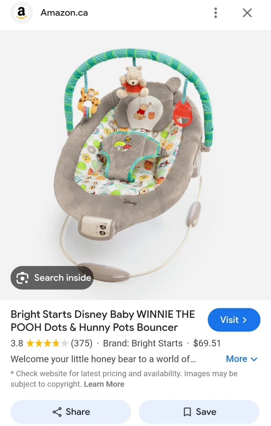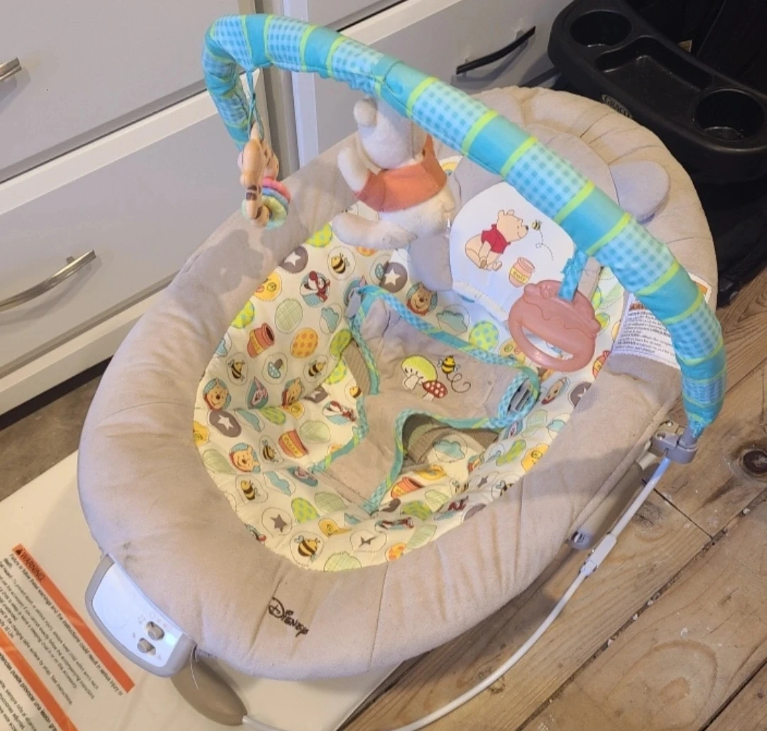 Selling a Winnie the Pooh themed baby bouncer from Disney Baby! It features a cute Winnie the Pooh design and a toy bar with hanging toys to keep your little one entertained. Perfect for infants and small babies.