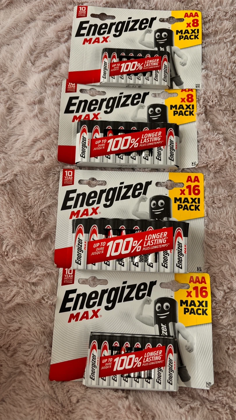 I'm selling packs of Energizer MAX batteries. from AA or AAA sizes, and they come in maxi packs. The AA packs have 16 batteries each, while the AAA packs have 8 batteries each. These batteries are designed to last longer and have a 10-year shelf life!