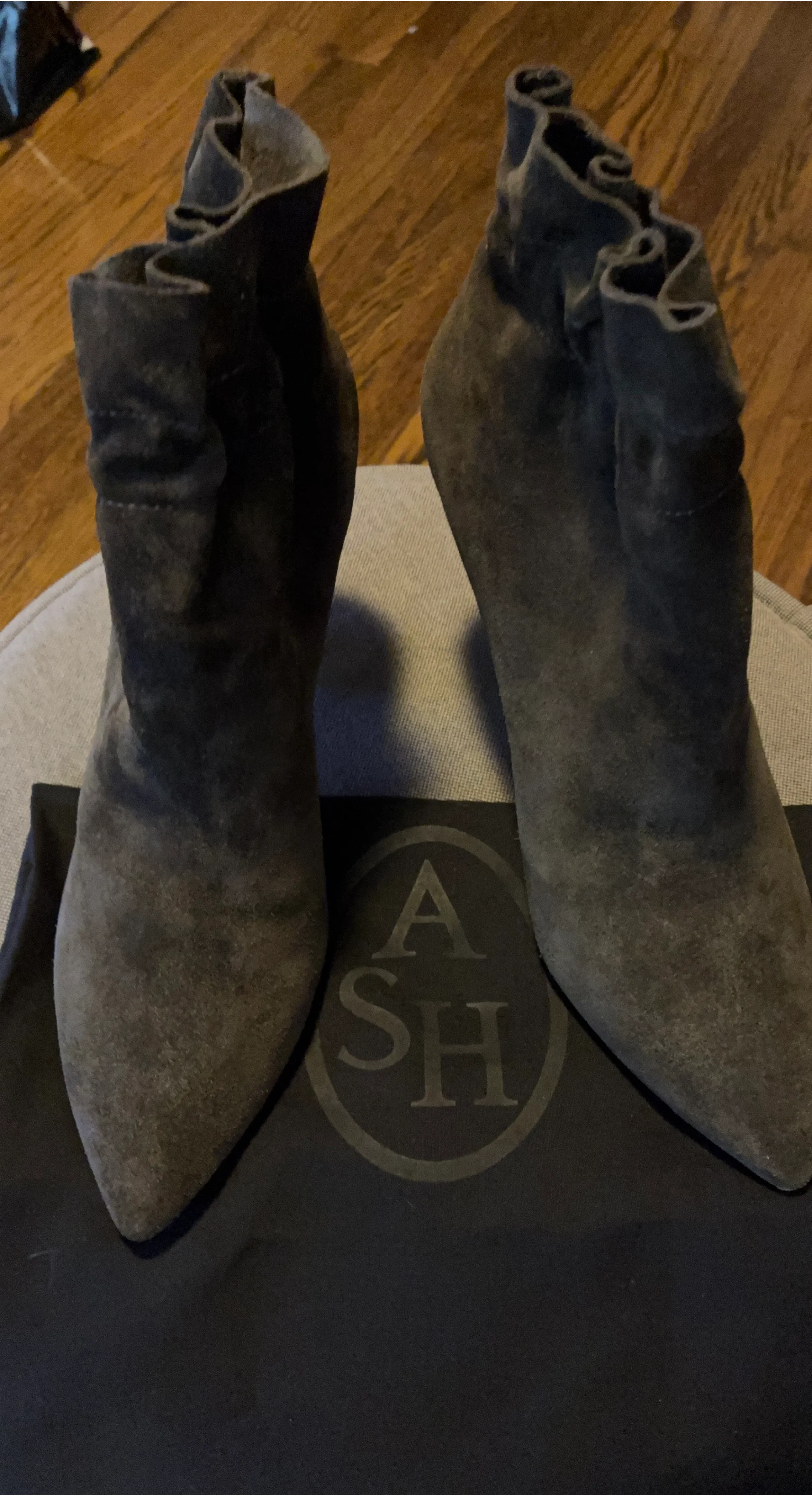 Selling a pair of ASH ankle boots in a size 37. They are made of suede and have a stylish design. The boots are in good condition with some wear on the soles.