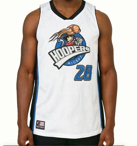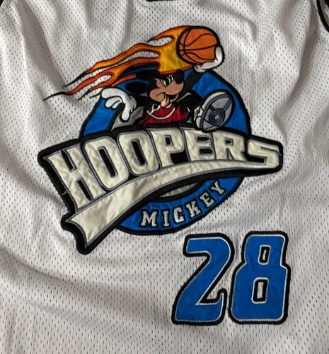This is a vintage "Hoopers Mickey" basketball jersey from Walt Disney World. The jersey features a graphic of Mickey Mouse dribbling a basketball with flames, and the number "28" is prominently displayed below the graphic. It is a men's jersey Looks virtually new SIZE✨XL Pit to pit: 24” Length: 30”