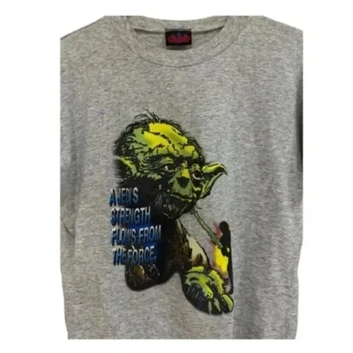 Authentic vintage 1996 Star Wars: Return of the Jedi tee featuring the iconic quote “A Jedi’s Strength Flows from the Force” with Yoda graphic. A true collector’s piece for Star Wars fans and vintage lovers alike. Perfect for Y2K, sci-fi, streetwear, or vintage graphic tee collectors. Super rare and hard to find in this condition — once it’s gone, it’s gone.