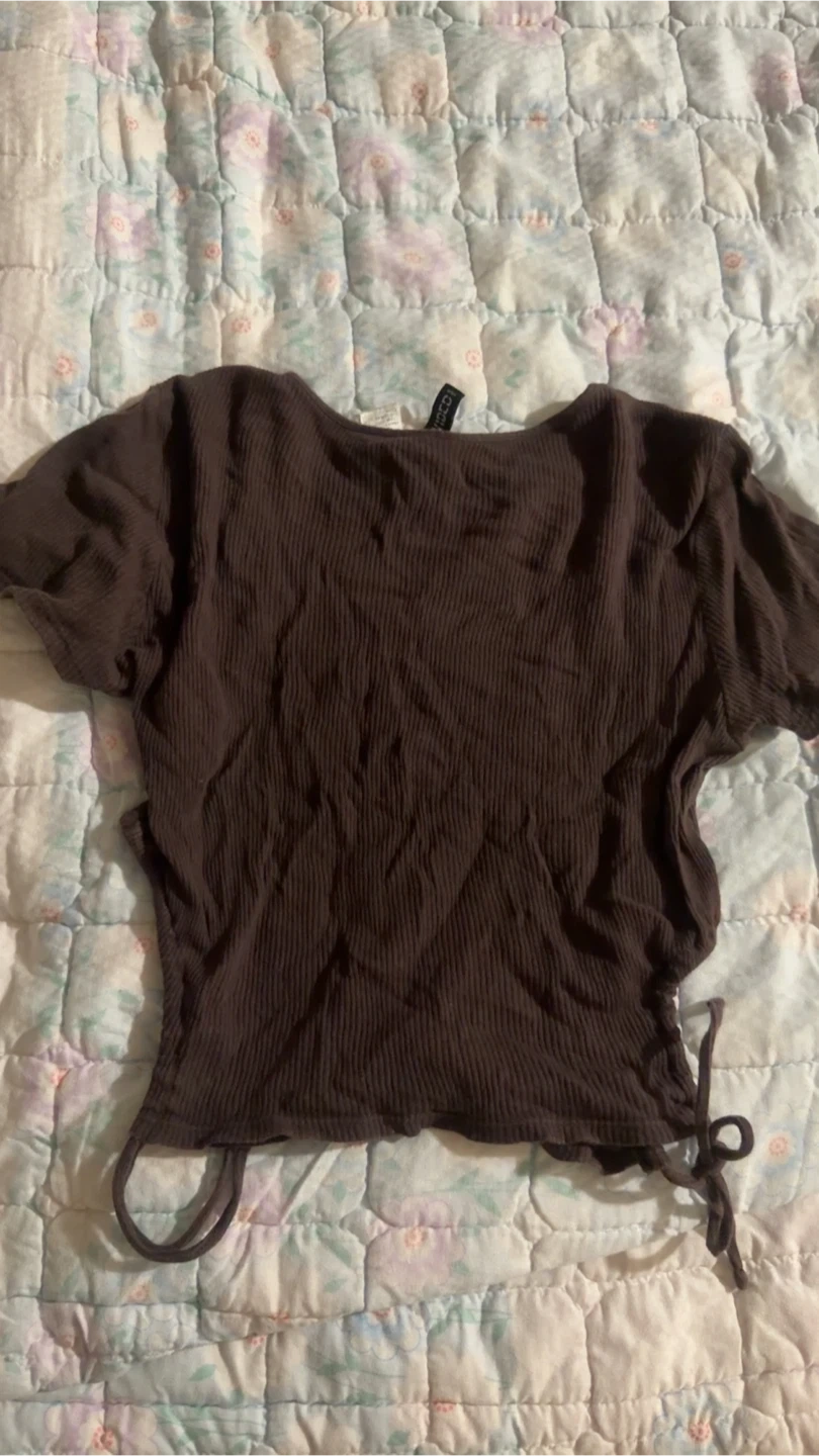 Selling a cute H&M brown ribbed top with tie-up details on the sides! It's a size small and in great condition. Perfect for adding a little something extra to your outfit