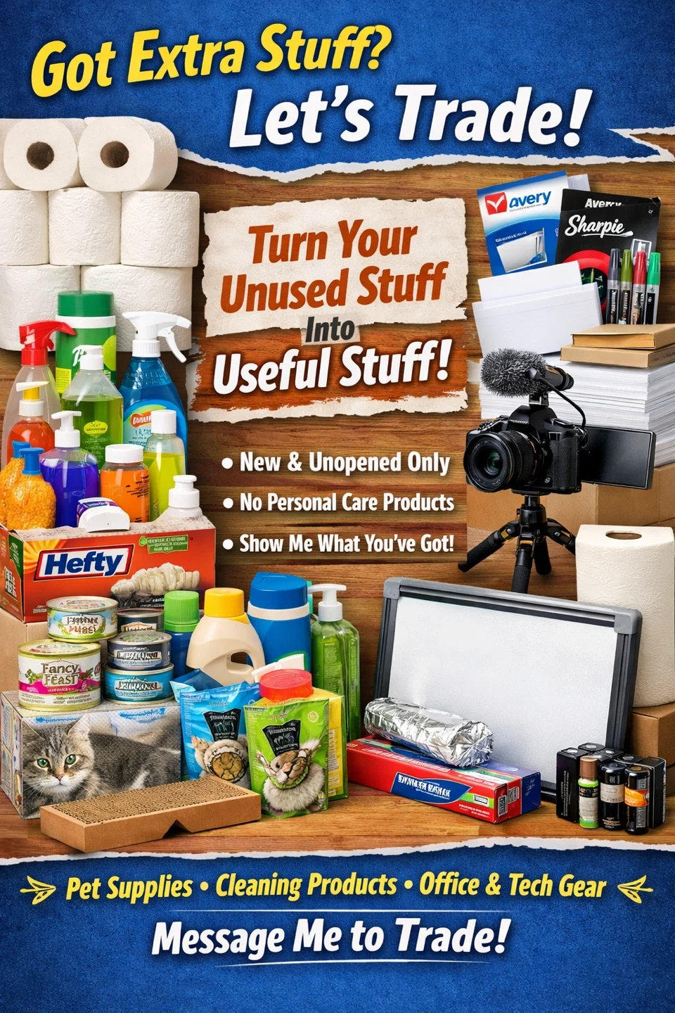 I trade for unopened, practical household items that people commonly overbuy, duplicate, or never quite use — and turn them into things I actually go through on a regular basis. You free up space. I restock essentials. Everyone wins.