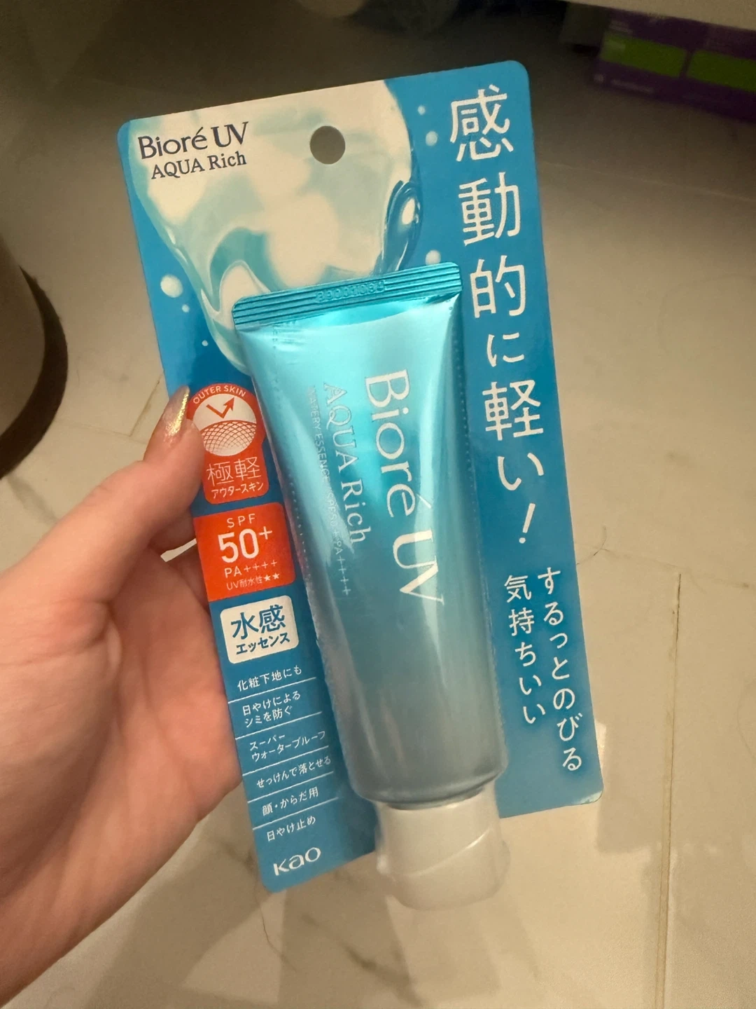 Selling a tube of Biore UV Aqua Rich Watery Essence sunscreen! It's SPF50+ and PA++++, providing great protection. It's lightweight and feels nice on the skin. It's also water-resistant and can be washed off with soap. Perfect for face and body!