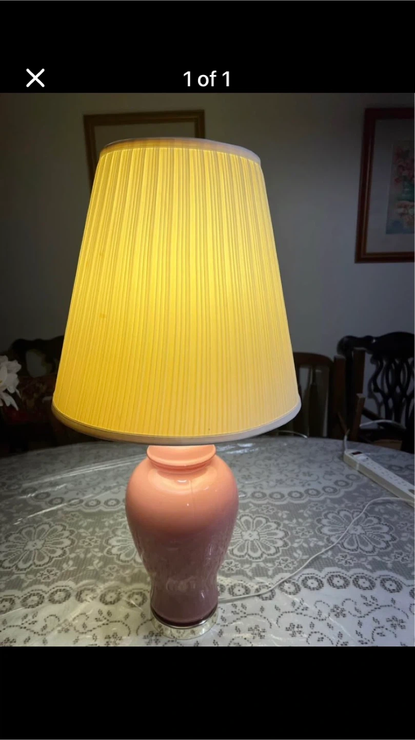 Selling a cute table lamp! It features a pink base and a yellow pleated shade. Perfect for adding a soft glow to any room