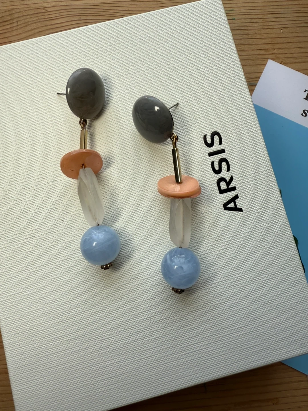 Cute earrings in a unique design! They feature grey, peach, clear, and blue beads. I got them in Japan.