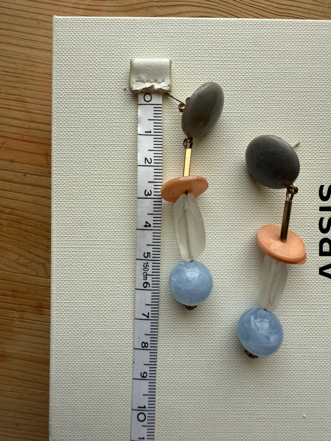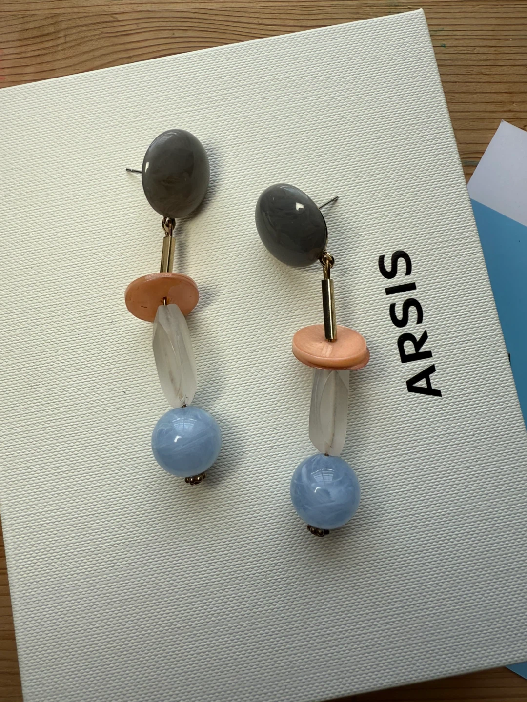 Cute earrings in a unique design! They feature grey, peach, clear, and blue beads. I got them in Japan.