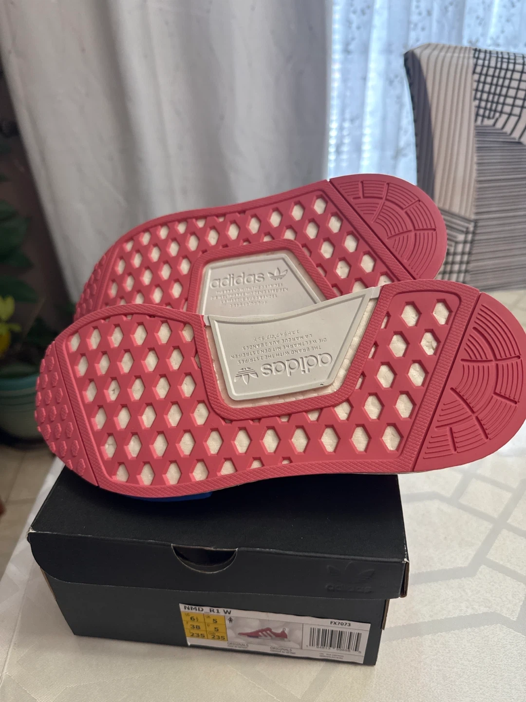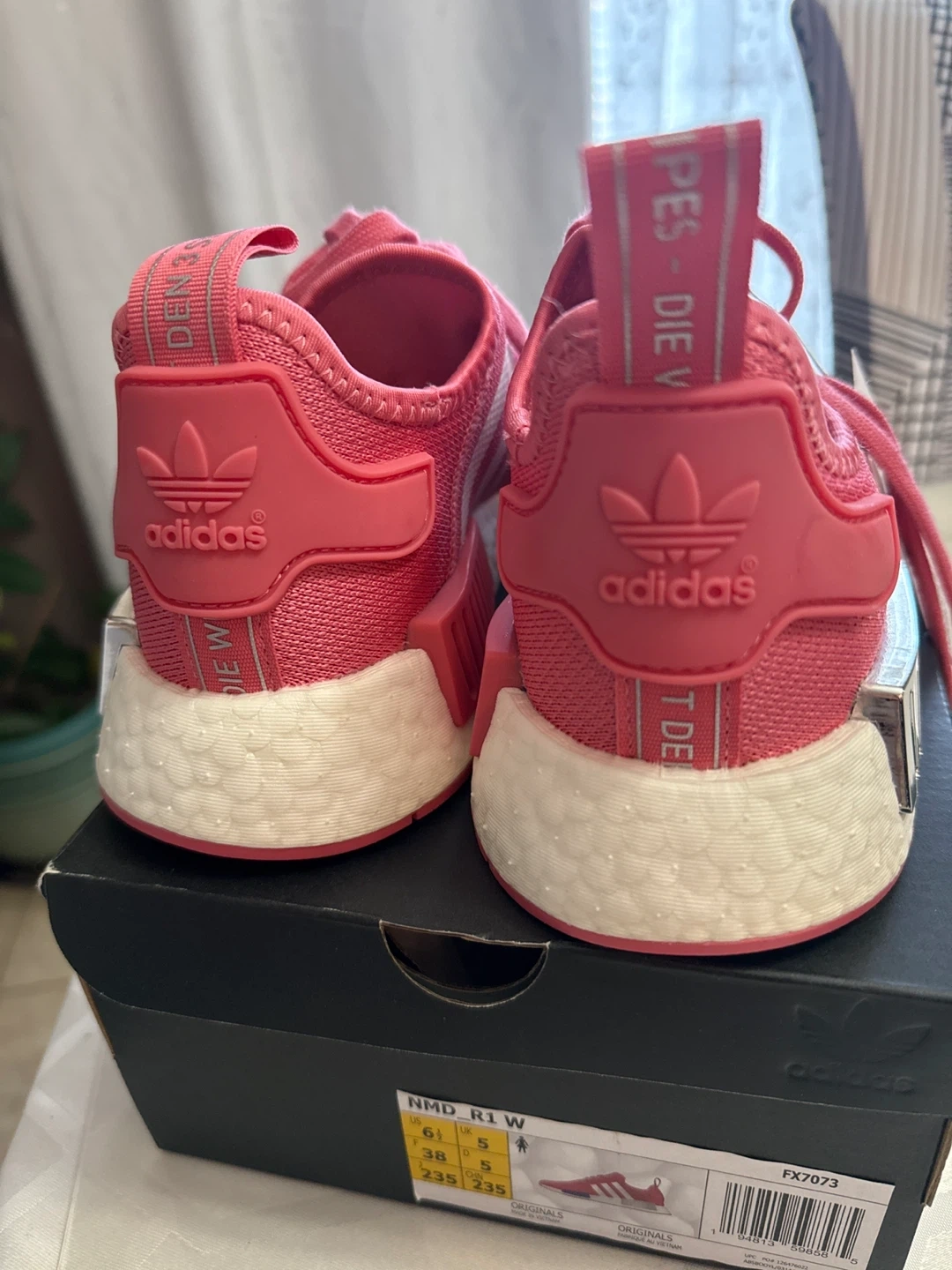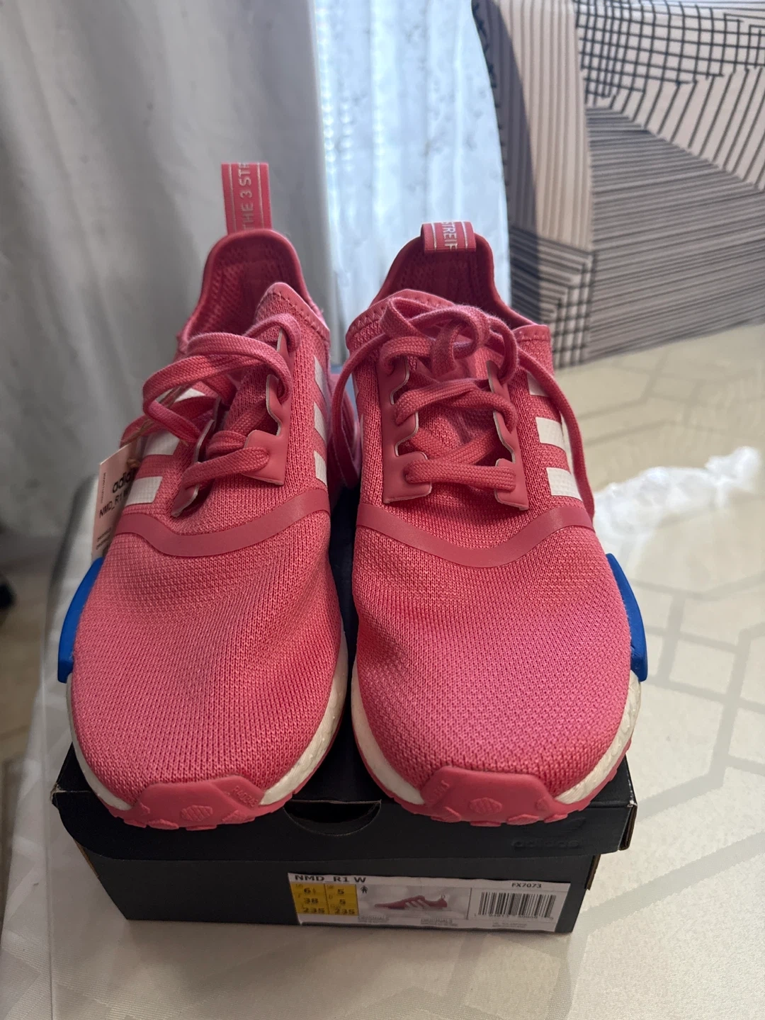 Selling a pair of Adidas NMD_R1 W shoes in pink! They are in great condition and come with the box. The size is 6.5 US