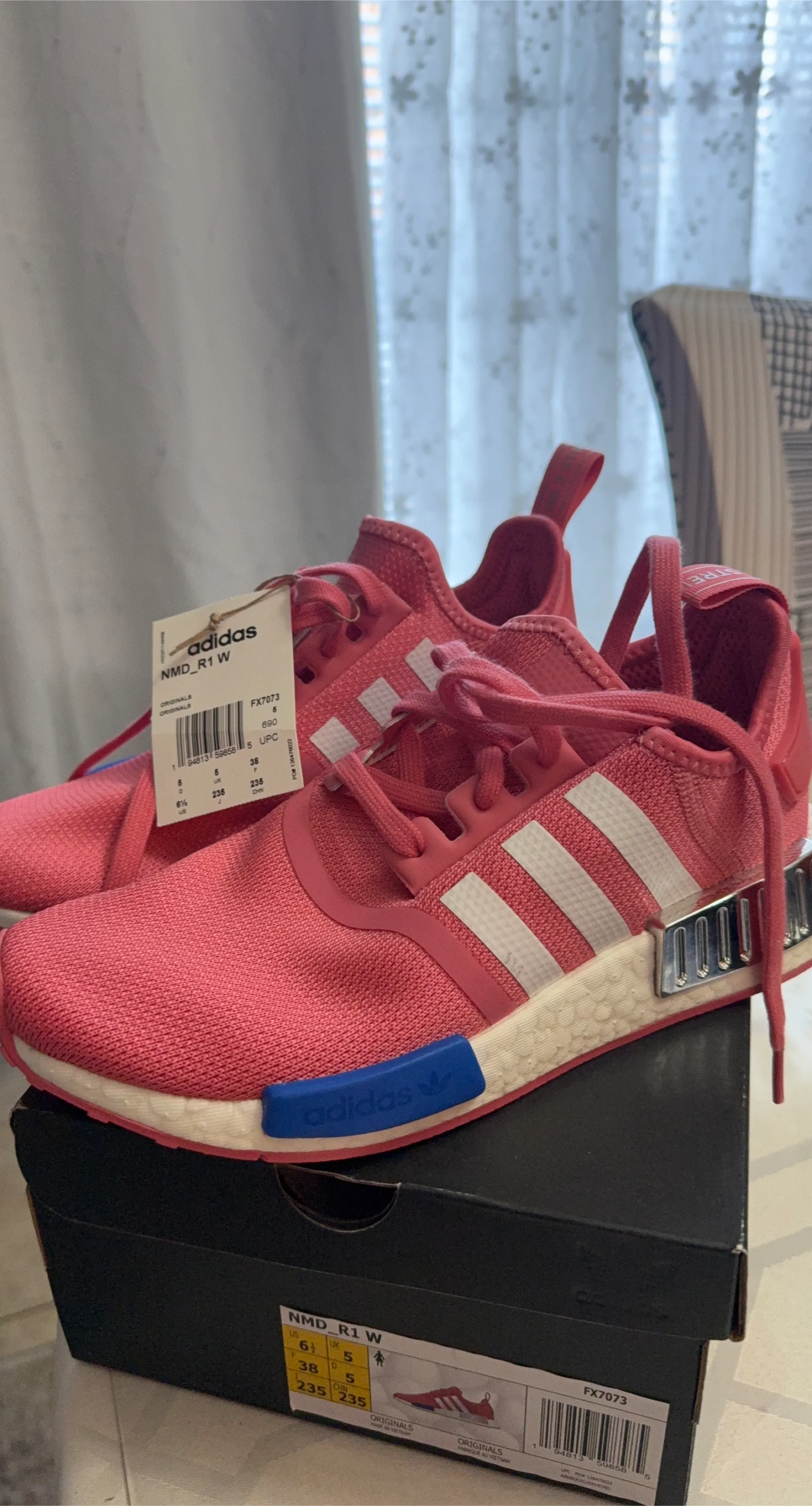 Selling a pair of Adidas NMD_R1 W shoes in pink! They are in great condition and come with the box. The size is 6.5 US