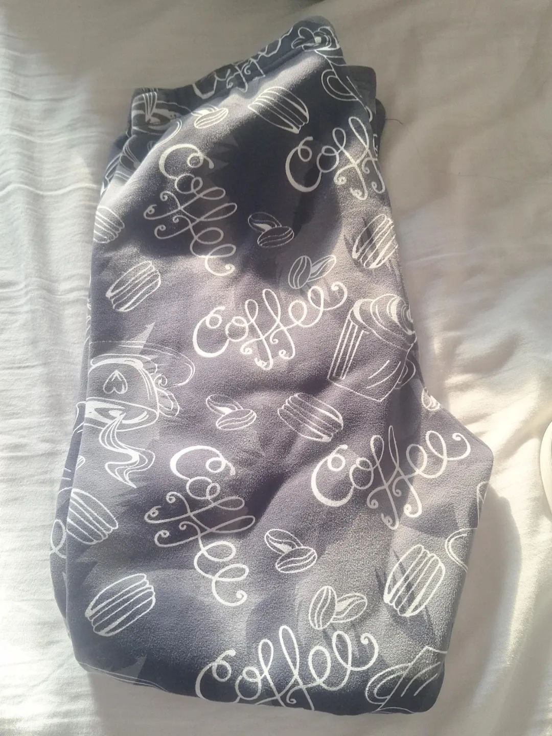 Cute leggings with a coffee print! They feature a fun design with coffee beans, coffee cups, and the word "Coffee" written all over. Perfect for cozy days or coffee lovers
