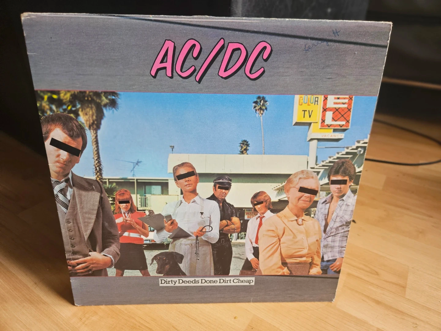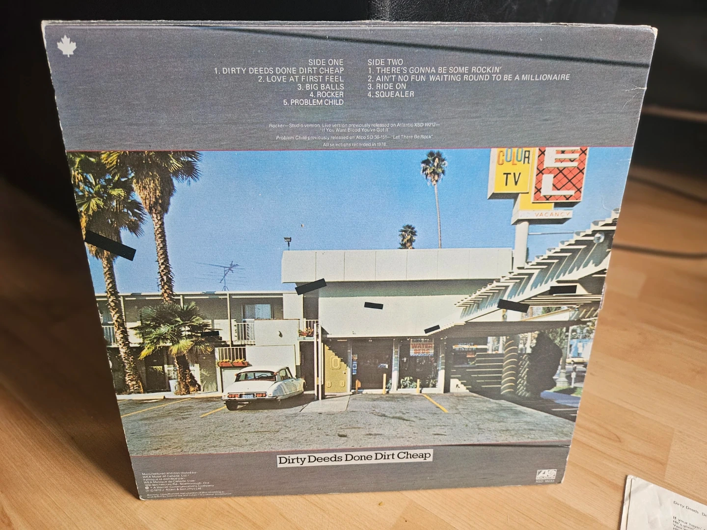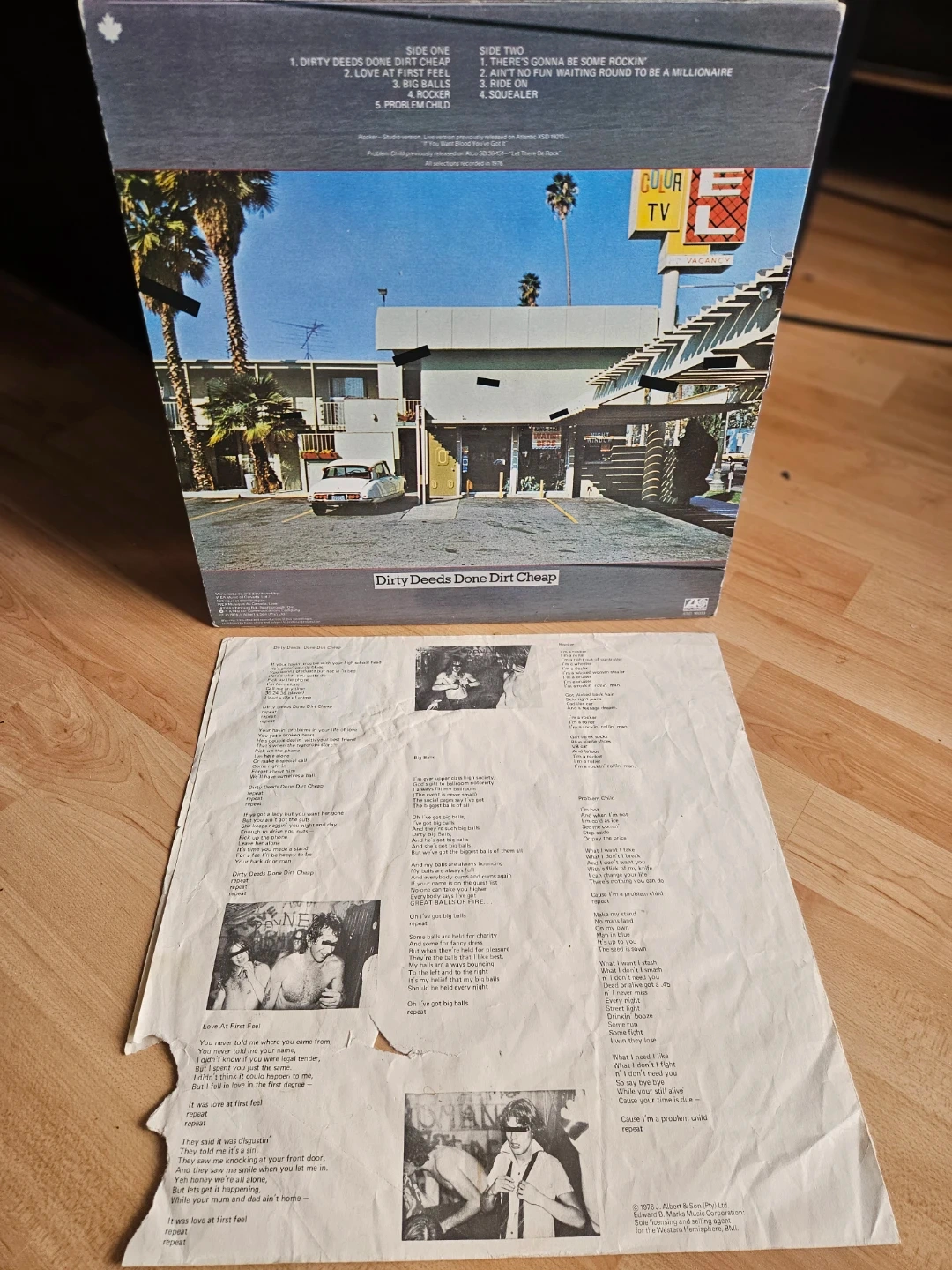 AC/DC "Dirty Deeds Done Dirt Cheap" LP. Features iconic title track and 'Big Balls'. Plays through with some crackling more noticeable during quiet sections. But it's AC/DC...so not many of those! It includes the lyric sheet.