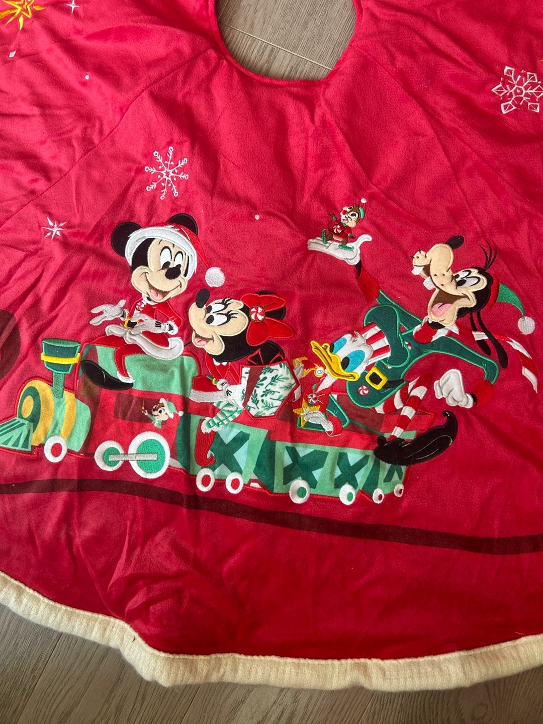 Adorable and Plush Disney Christmas tree skirt and stocking set! The tree skirt features Mickey, Minnie, Donald, and Goofy on a train, while the stocking has Mickey and Minnie designs. Perfect for adding a touch of Disney magic to your Christmas decor