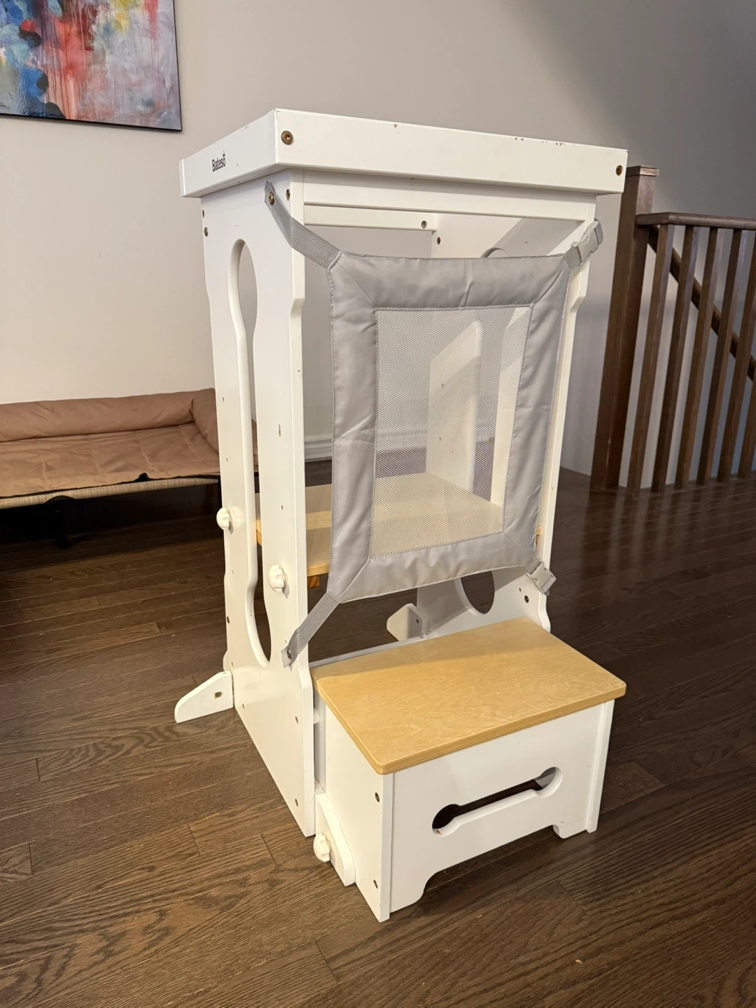 Selling a Bateso kids kitchen step stool. It's in great condition and perfect for helping your little one reach the counter safely. The stool is white with a natural wood step and features a safety net for added security. Great for ages 18 months and up!