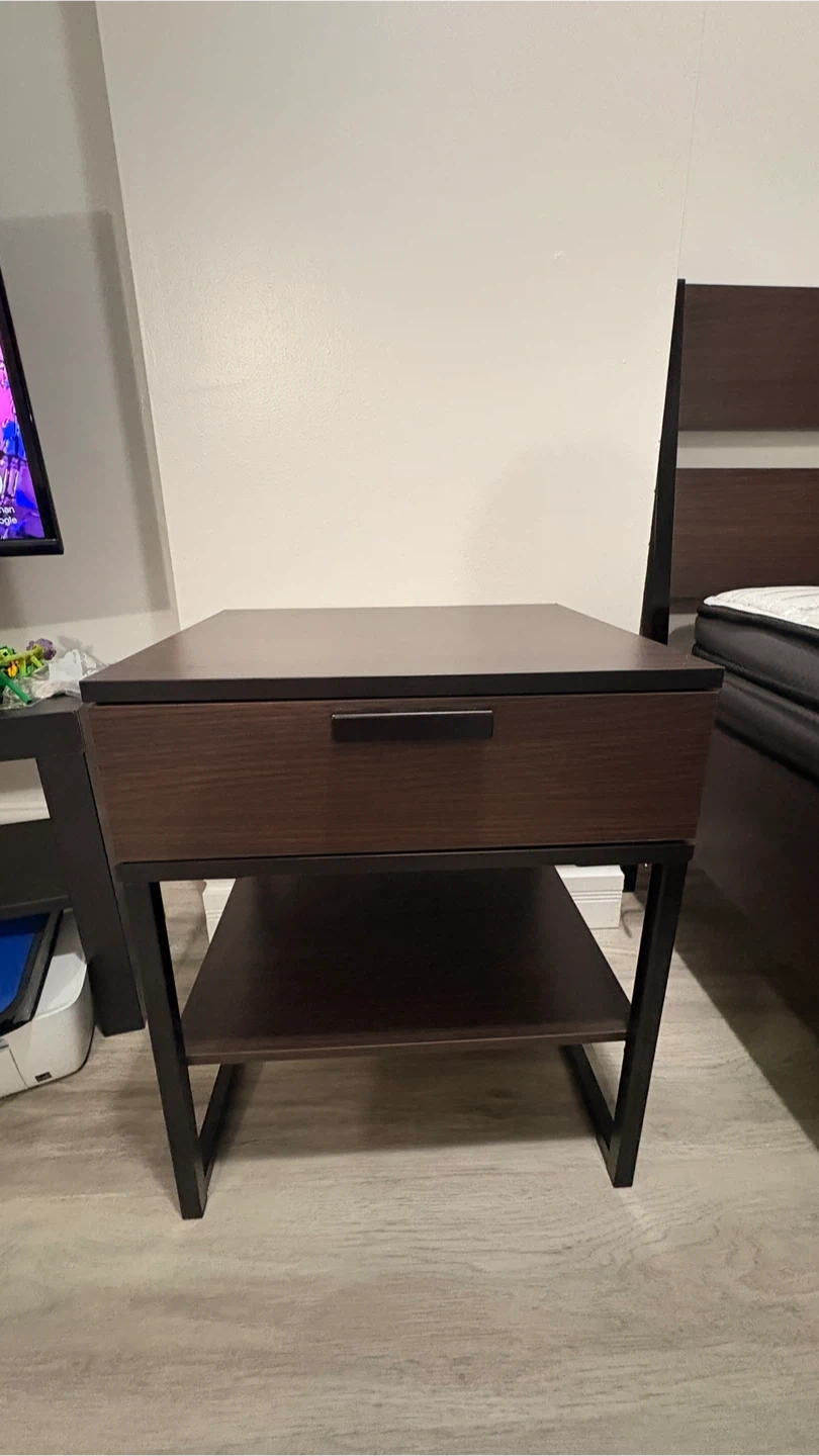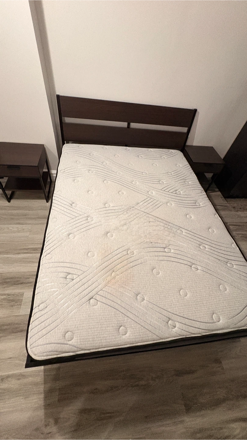Selling a Queen size bed frame with a Sealy mattress along with two matching nightstands. The set is in good condition and would be perfect for a bedroom setup. The nightstands have a drawer and a shelf for storage.