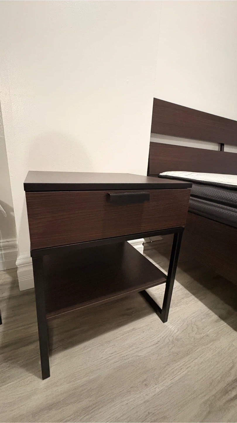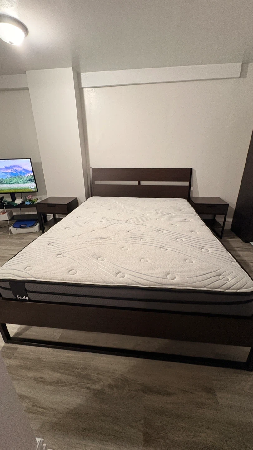 Selling a Queen size bed frame with a Sealy mattress along with two matching nightstands. The set is in good condition and would be perfect for a bedroom setup. The nightstands have a drawer and a shelf for storage.