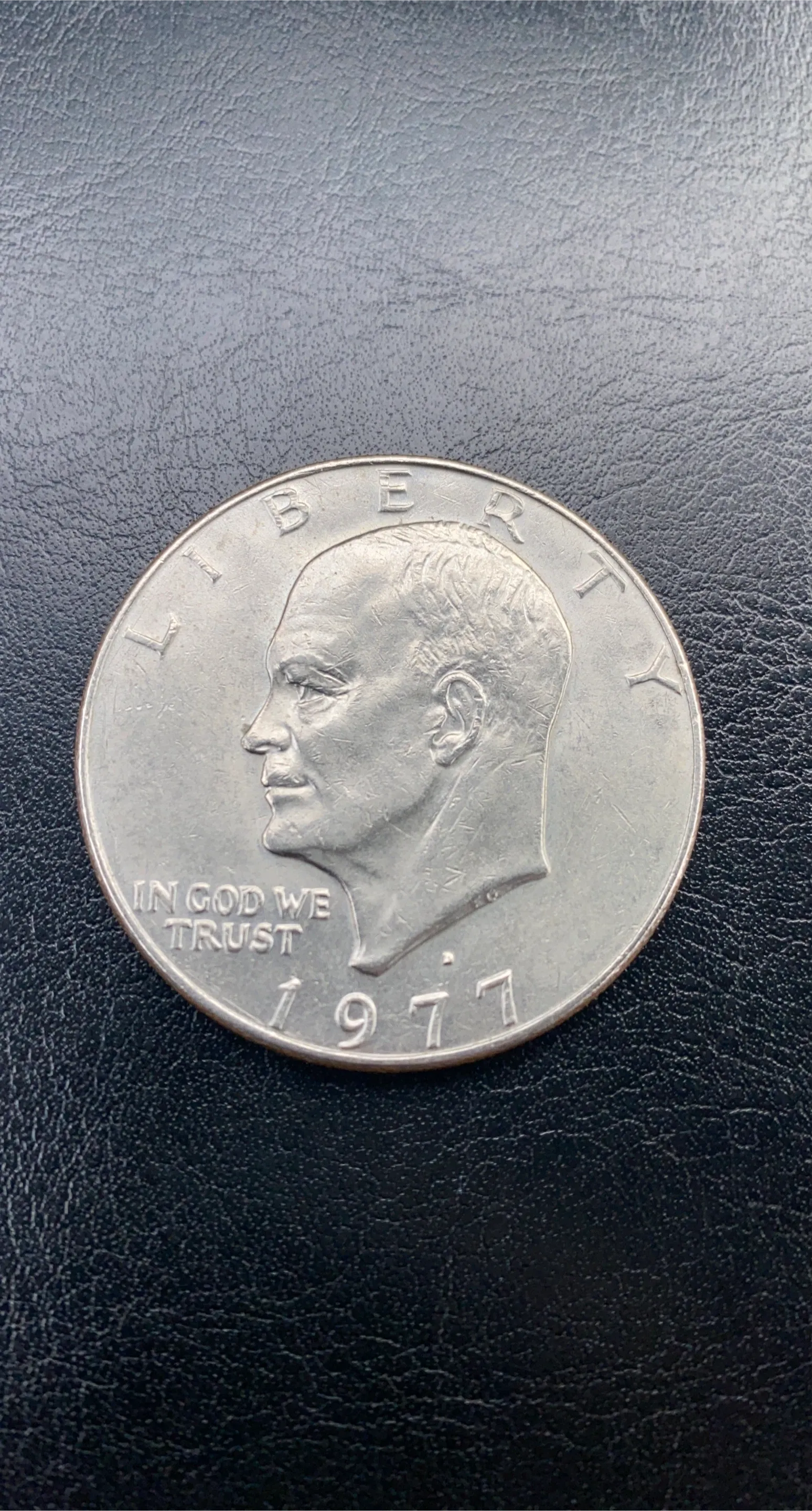 Selling a 1977 Eisenhower one dollar coin. It features the portrait of President Dwight D. Eisenhower on the obverse and an eagle landing on the moon on the reverse. A great piece for coin collectors!