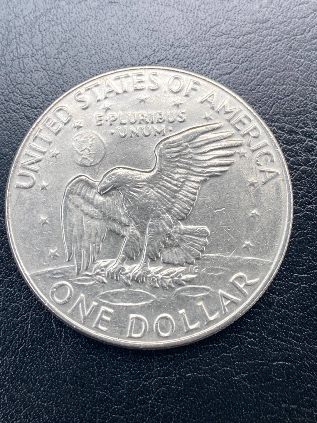 Selling a 1977 Eisenhower one dollar coin. It features the portrait of President Dwight D. Eisenhower on the obverse and an eagle landing on the moon on the reverse. A great piece for coin collectors!