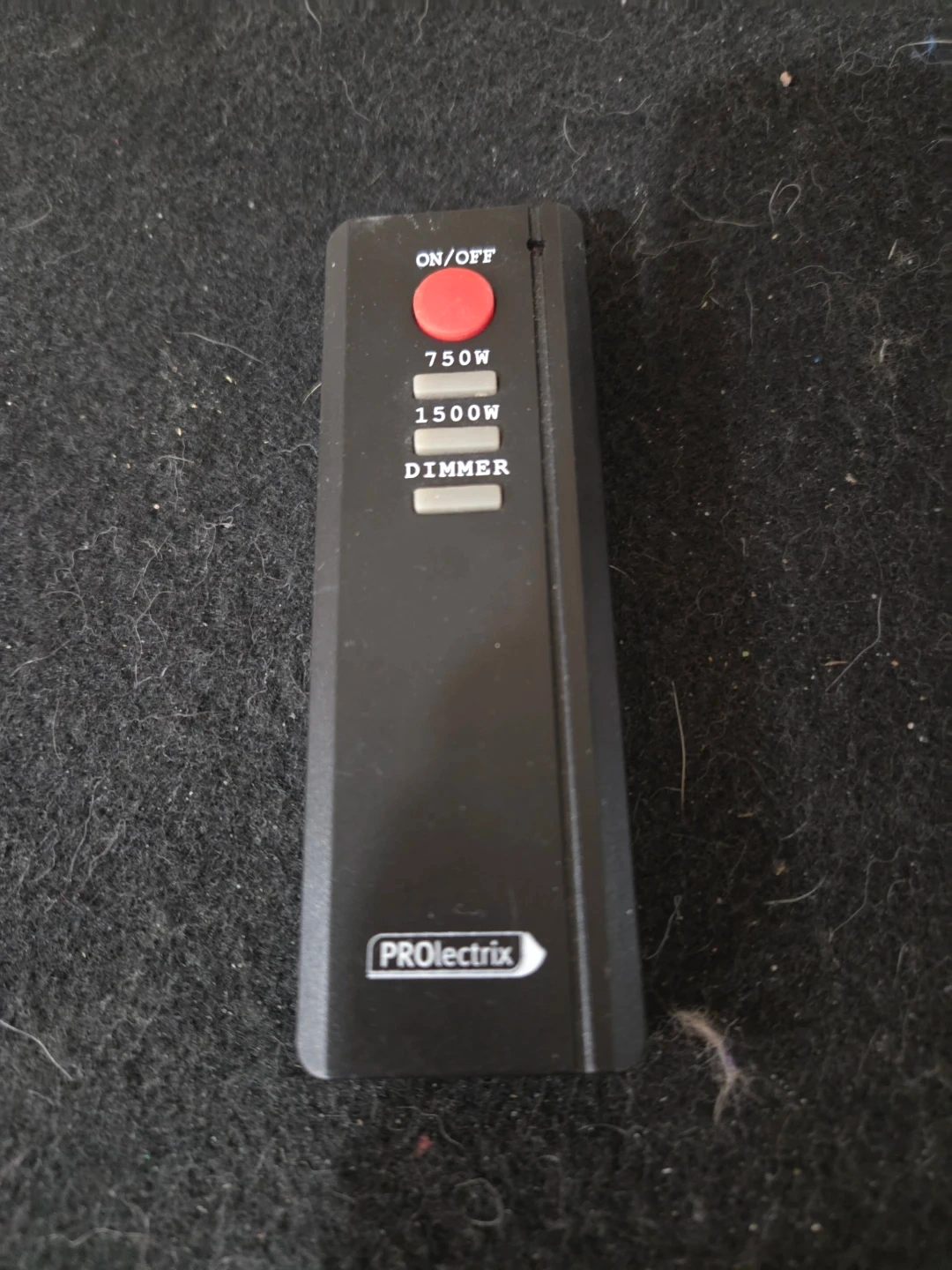 Selling a Prolectrix electric fireplace. It features adjustable settings of 750W and 1500W, along with a dimmer function. Comes with a remote control for easy operation