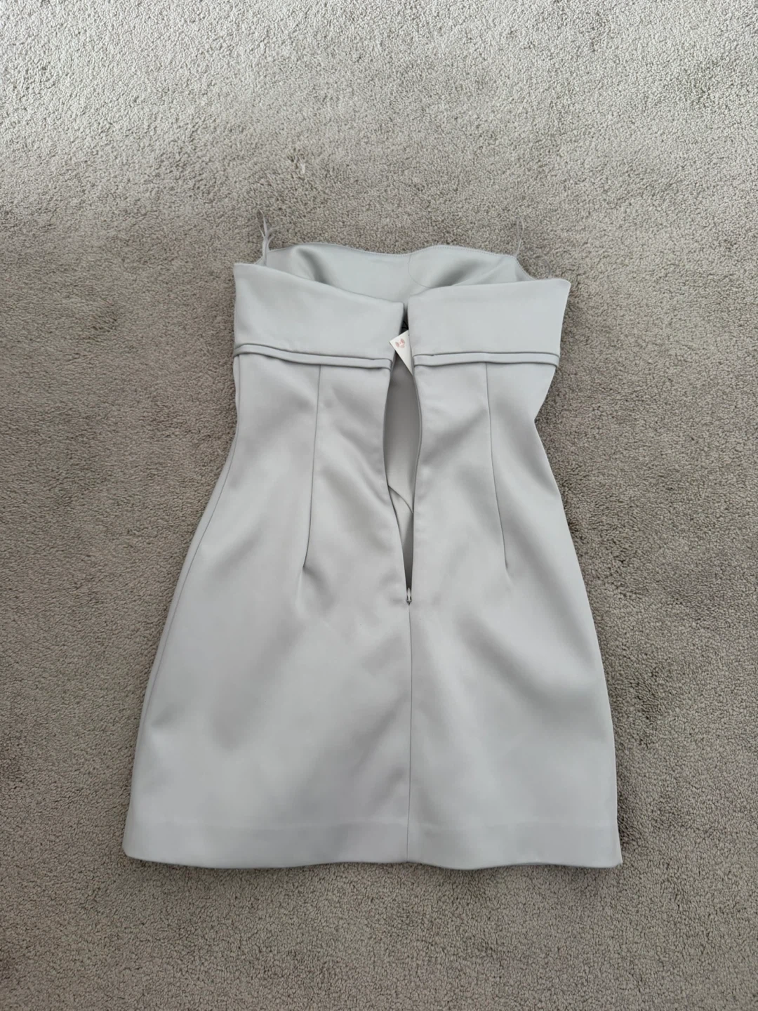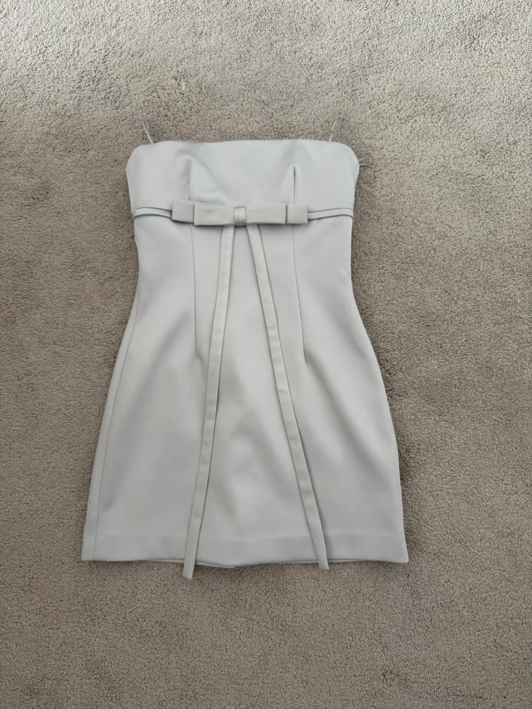 Selling a Zara strapless satin dress with a cute bow detail! It's a size XS and in a lovely pearl gray colour. Originally bought for $69.90!