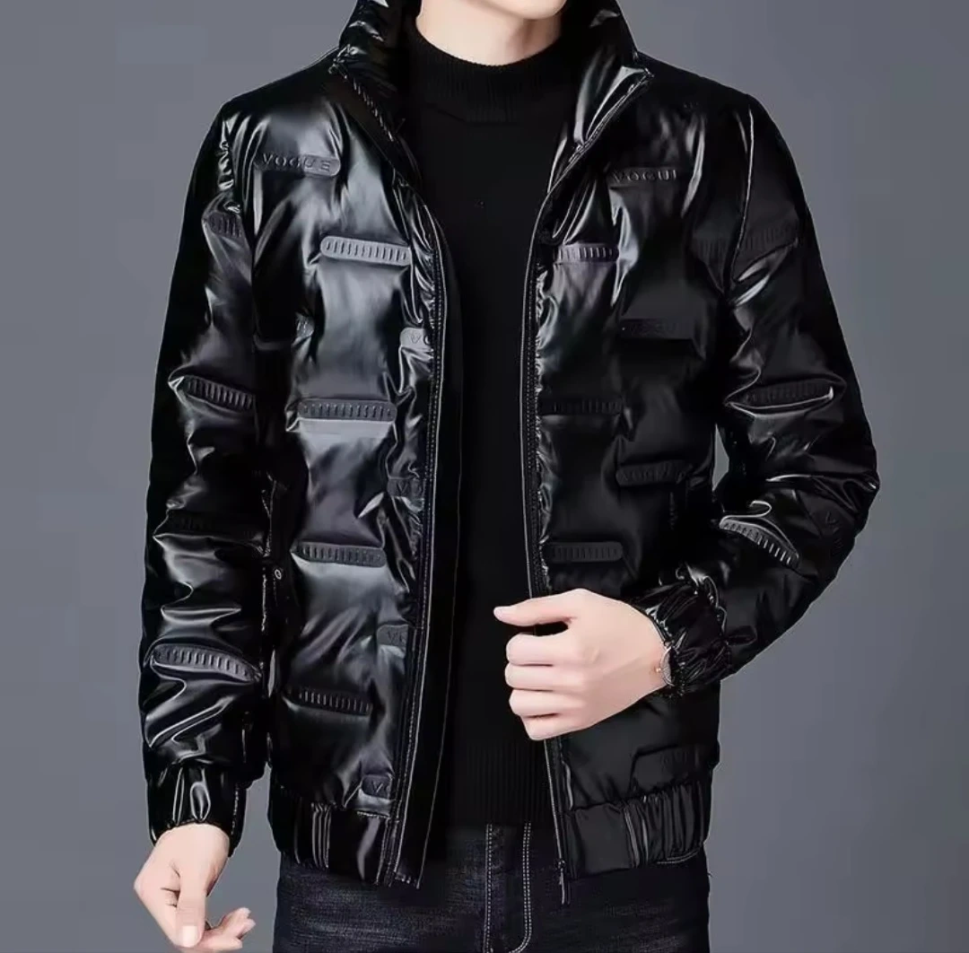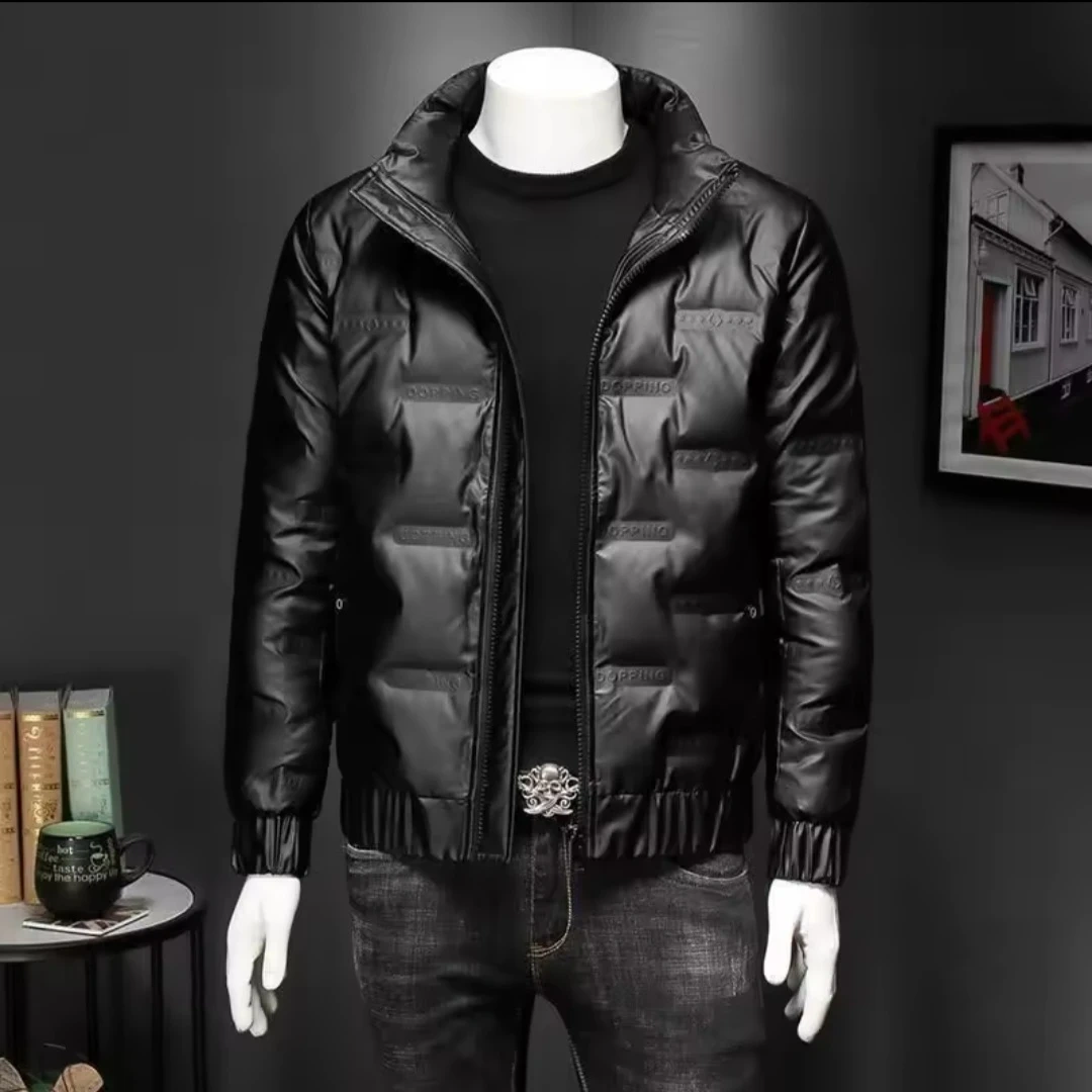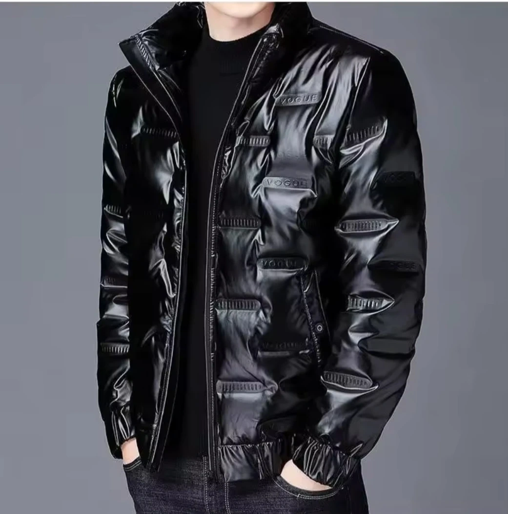This black puffer jacket is in great condition. The jacket features a unique design with embossed lettering. It's perfect for staying warm and stylish during the colder months!