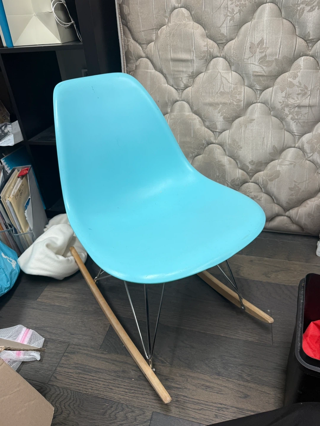This light blue rocking chair is in good condition and ready for a new home! It features a sleek design with metal supports and wooden rockers. Perfect for adding a touch of modern style to any room