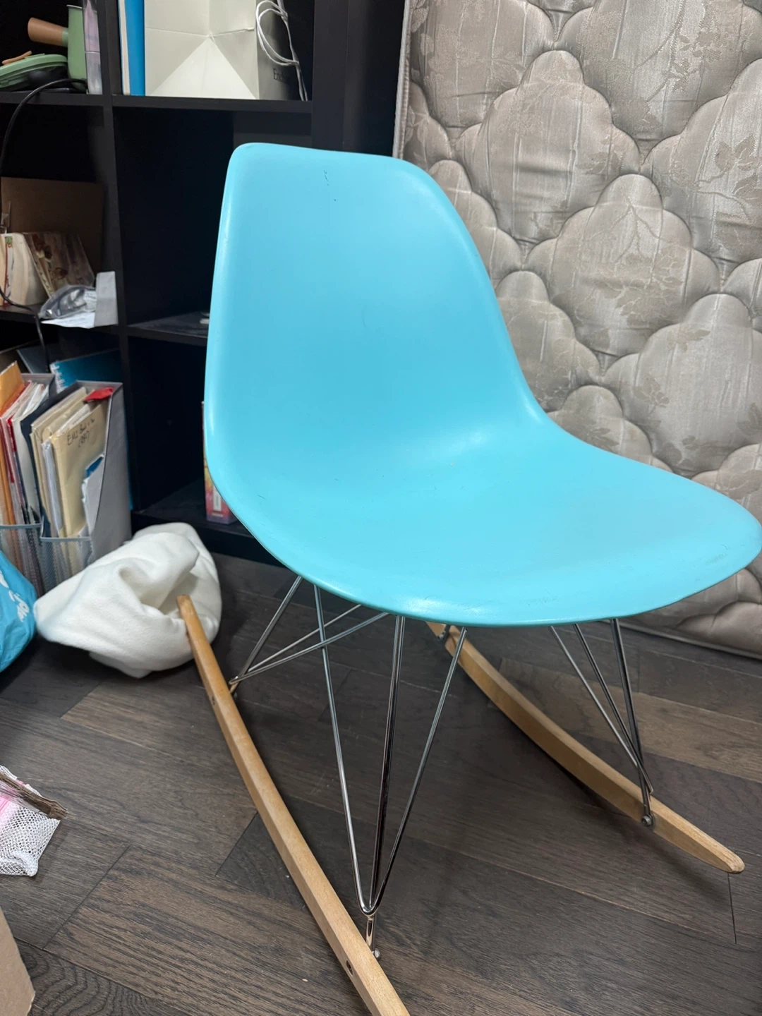 This light blue rocking chair is in good condition and ready for a new home! It features a sleek design with metal supports and wooden rockers. Perfect for adding a touch of modern style to any room