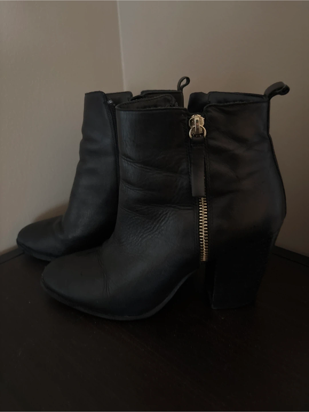 These are a pair of black leather ankle boots. They feature a zipper detail on the side. They're in good condition and ready for a new adventure!