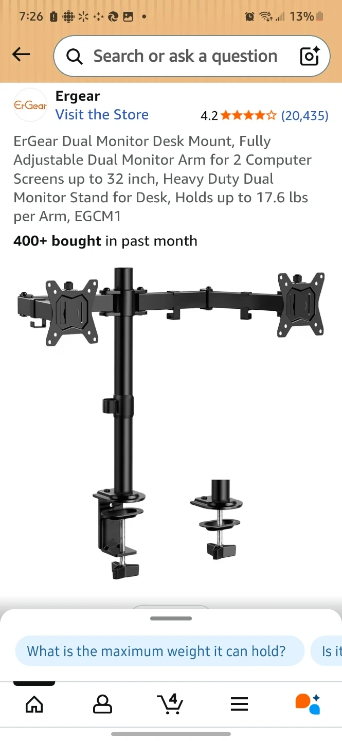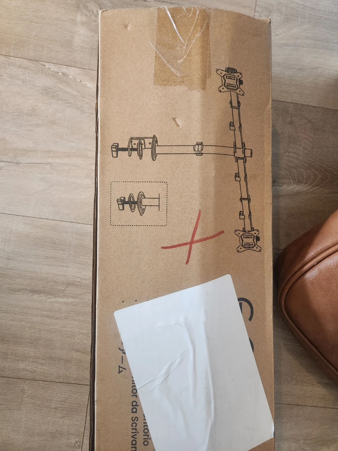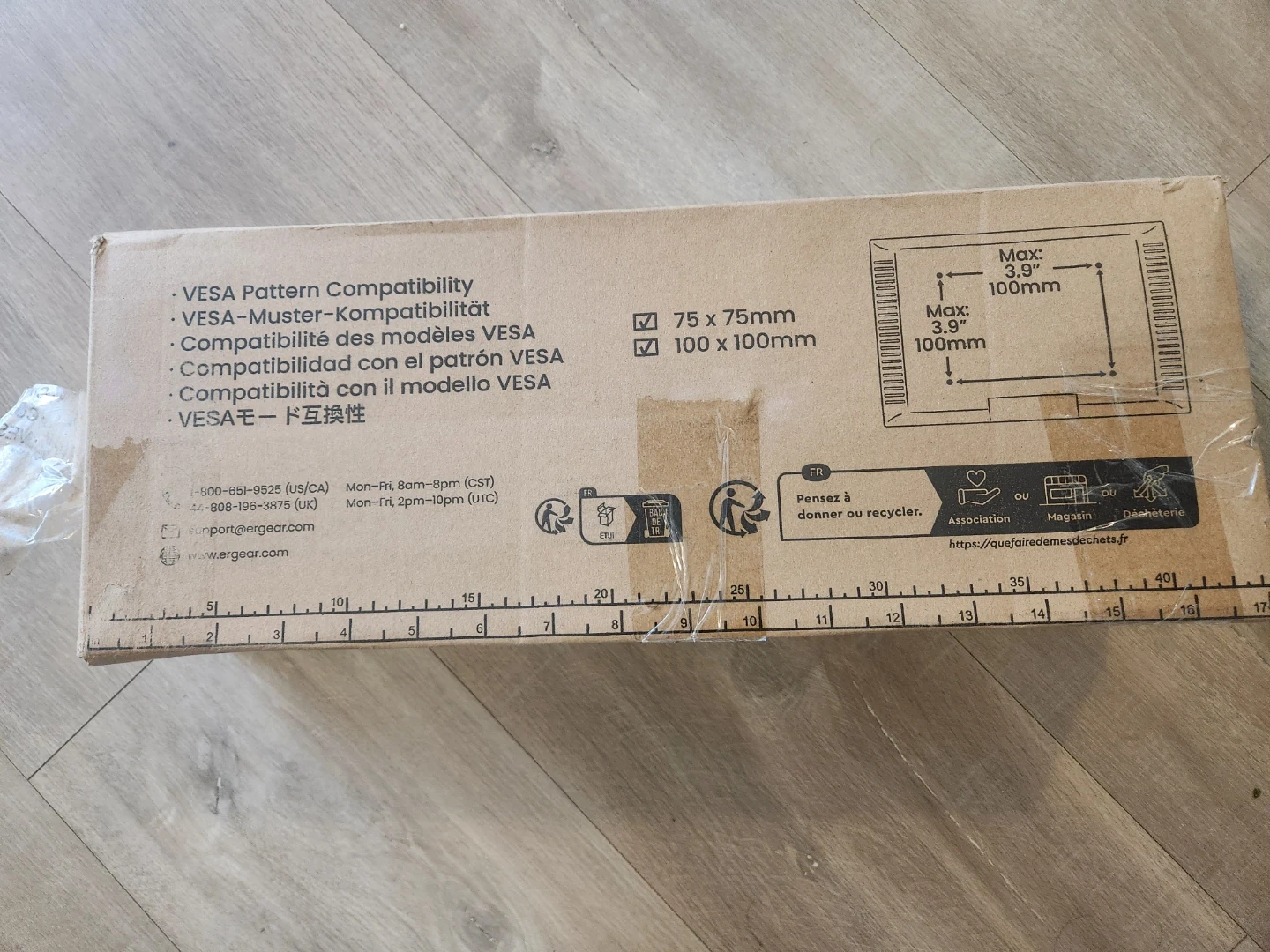 Monitor arm with VESA pattern compatibility. The box indicates it supports 75 x 75mm and 100 x 100mm VESA patterns. Max length is 3.9" or 100mm. Please see photos for details