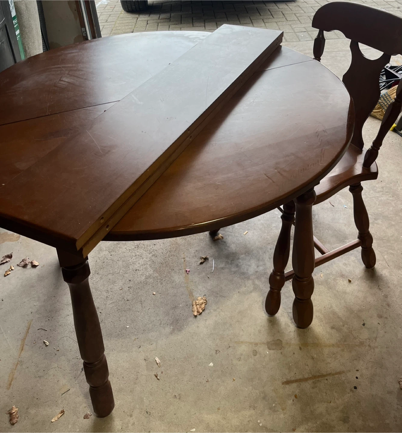 Selling a solid maple round wooden dining table that comes with a leaf insert to extend the table. Also includes four matching chairs. It's in good used condition and ready for a new home!