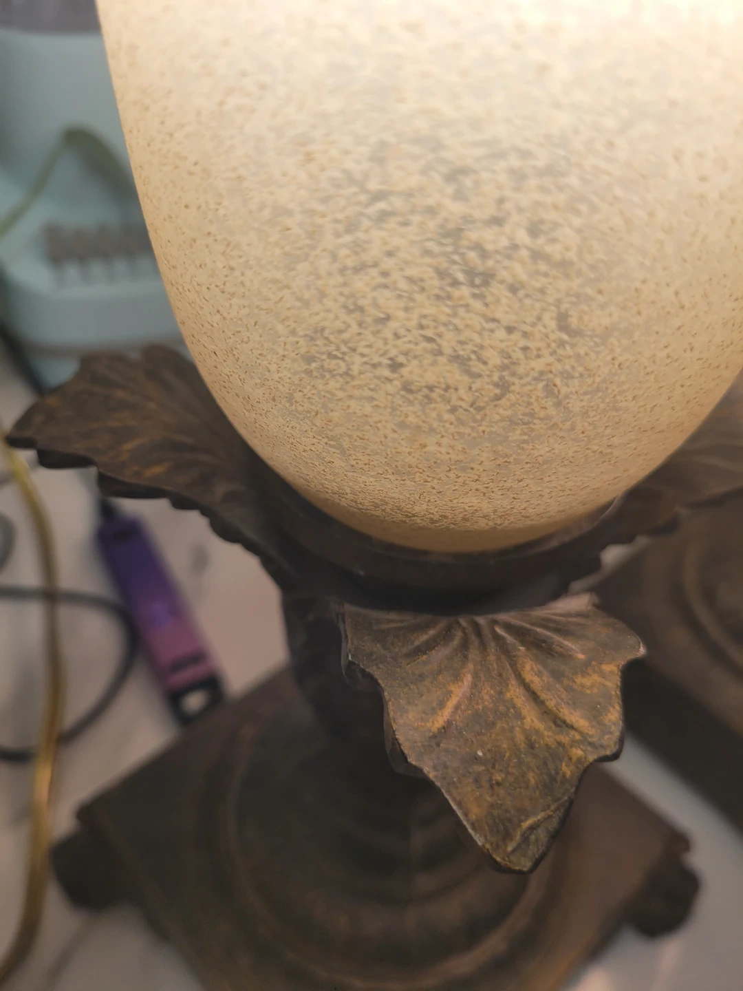 Selling a pair of vintage table lamps. They have a beautiful, ornate base and a frosted glass shade that gives off a warm glow. Perfect for adding a touch of elegance to any room!