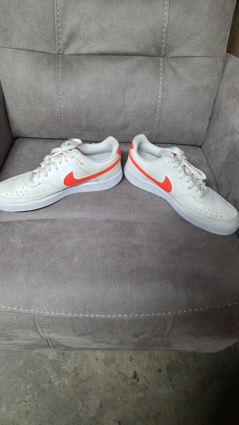 These Nike Court Vision Low sneakers are in great condition! They feature a classic design with a white leather upper and a vibrant orange Nike swoosh. Perfect for everyday wear or adding a sporty touch to your outfit