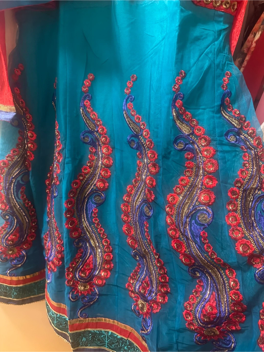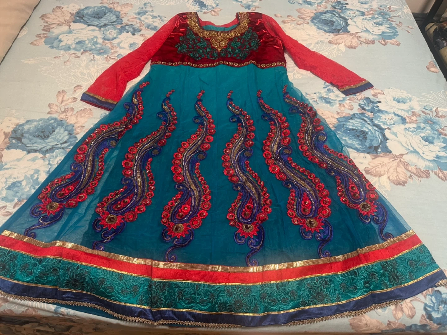 Beautiful Anarkali dress in red and blue with intricate embroidery. Perfect for special occasions!