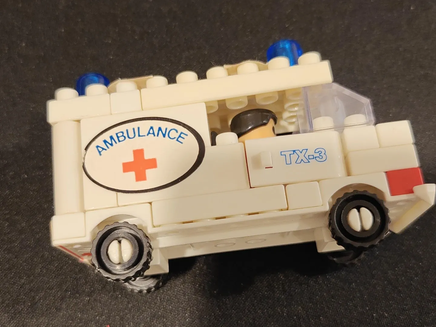 Here's a fun toy ambulance made of building blocks! It's in great shape and ready for a new adventure. The ambulance features a red cross and 'AMBULANCE' printed on the side. Perfect for kids who love building and emergency vehicles