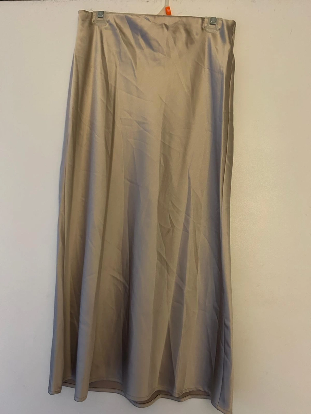 Size Medium. Flowy fabric in beige colour. Satin. Midi design. Straight design. Elastic band. Festival Season. Party and events collection. Office looks.