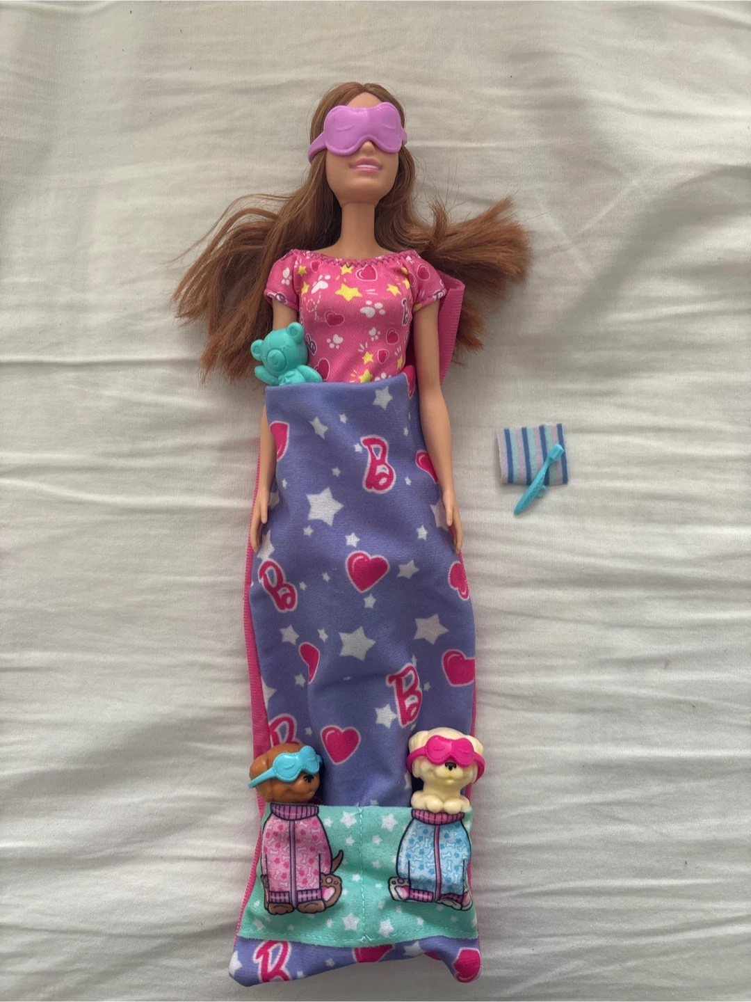 Here's a Barbie doll ready for bedtime! She comes with a sleeping bag, sleep mask, and a few cute little accessories for a fun night in. Perfect for imaginative play!
