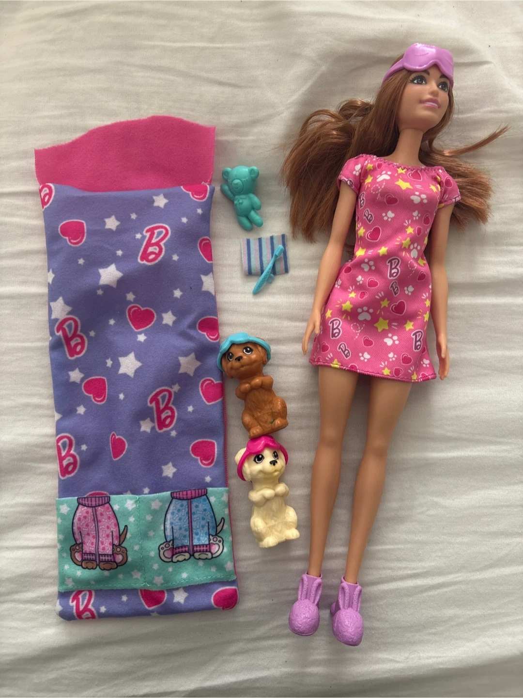 Here's a Barbie doll ready for bedtime! She comes with a sleeping bag, sleep mask, and a few cute little accessories for a fun night in. Perfect for imaginative play!