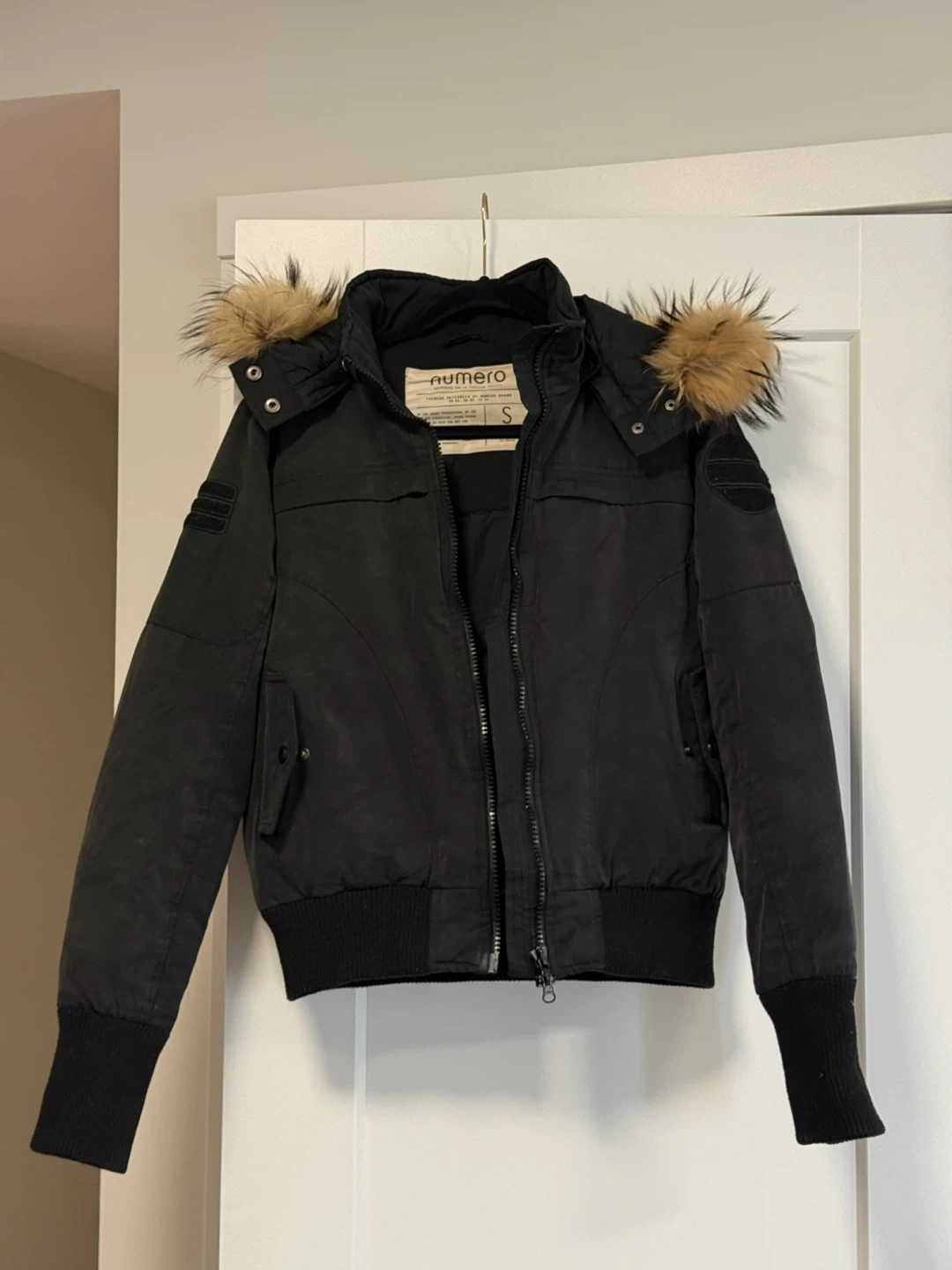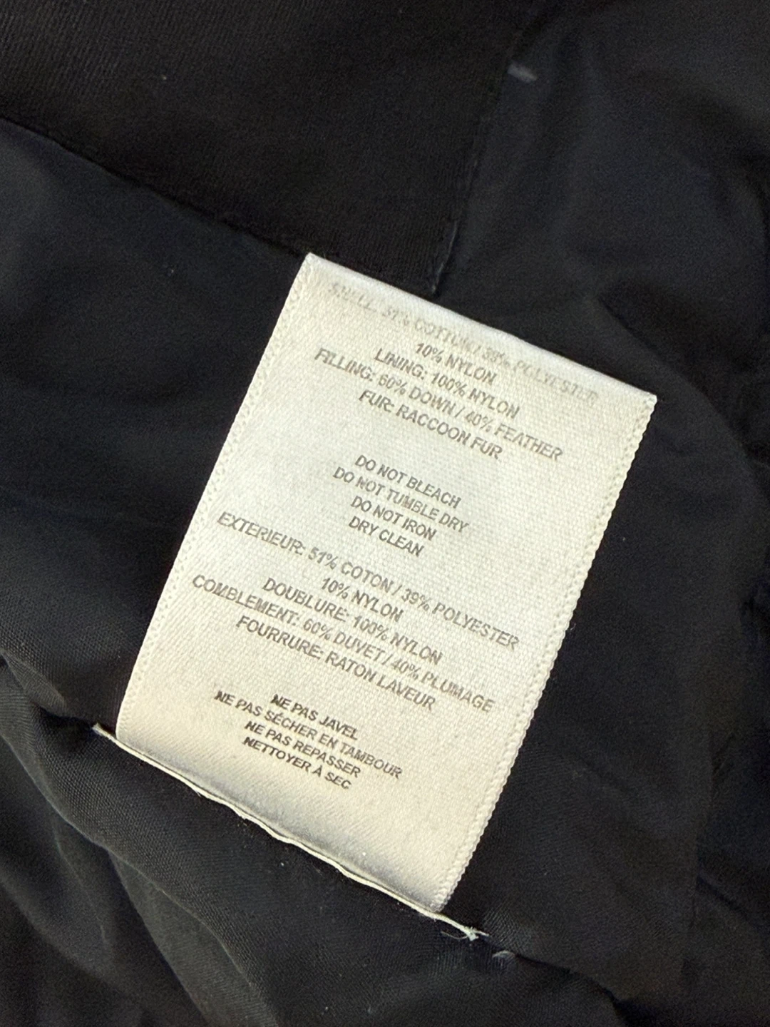 The outer shell is made of 51% cotton, 39% polyester, and 10% nylon. The lining is 100% nylon, and the filling is 60% down and 40% feather. The fur is raccoon fur