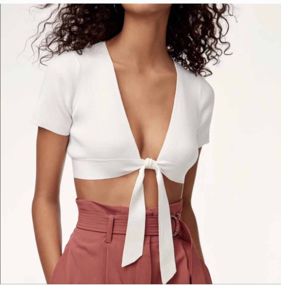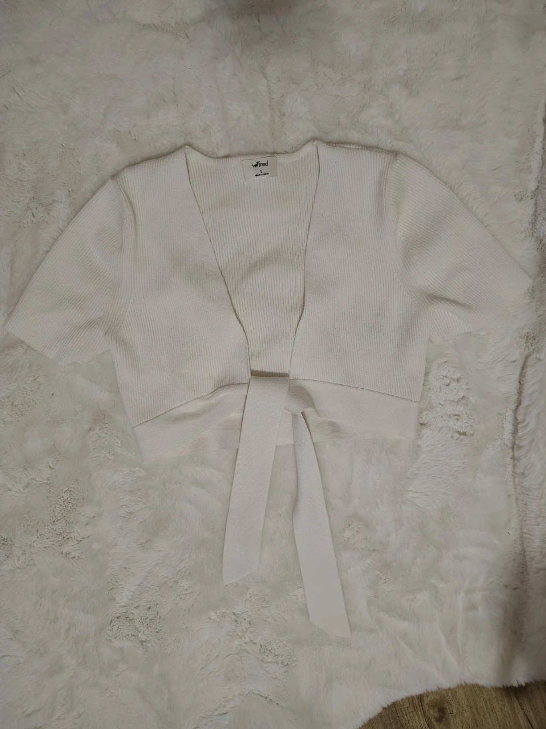 Selling a Wilfred tie-front cardigan in size small. It's a lovely, versatile piece that can be dressed up or down. Perfect for layering or wearing on its own! The material is soft and comfortable, and the tie-front detail adds a stylish touch, work once, just not something I reach for