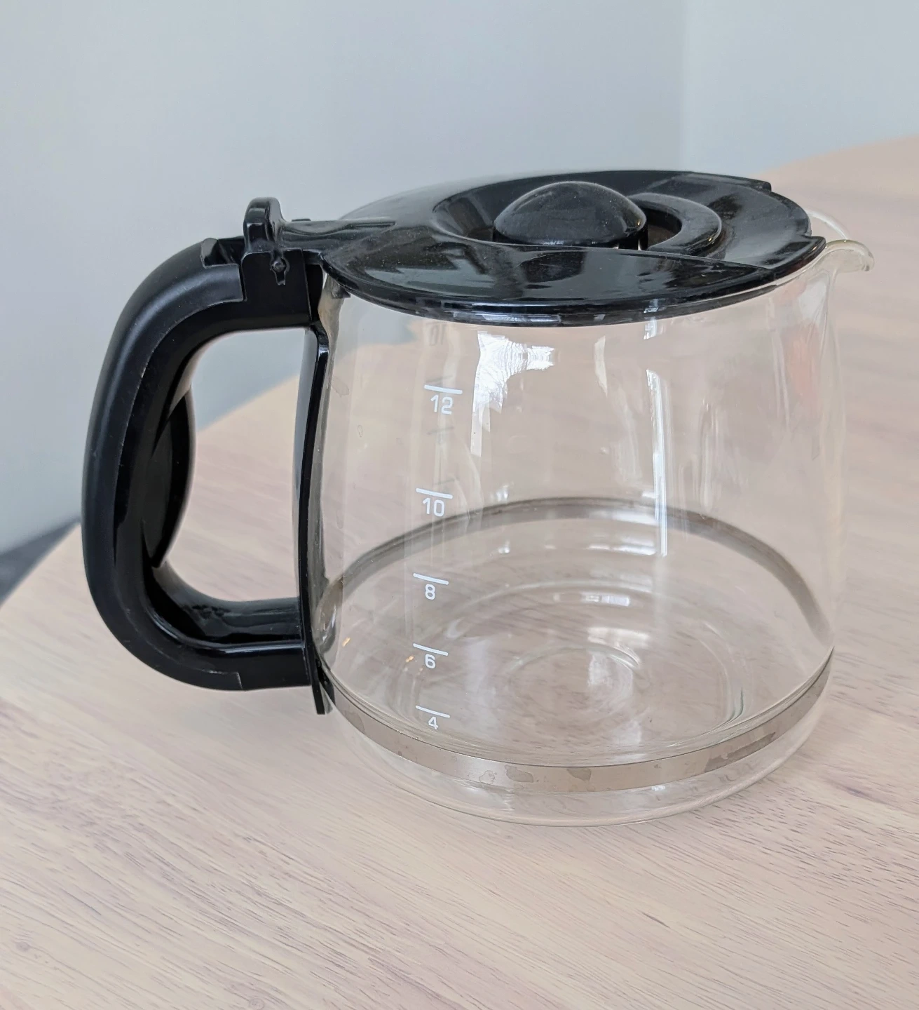 Selling a coffee maker carafe. It has a black handle and lid, and the glass is marked with measurements.