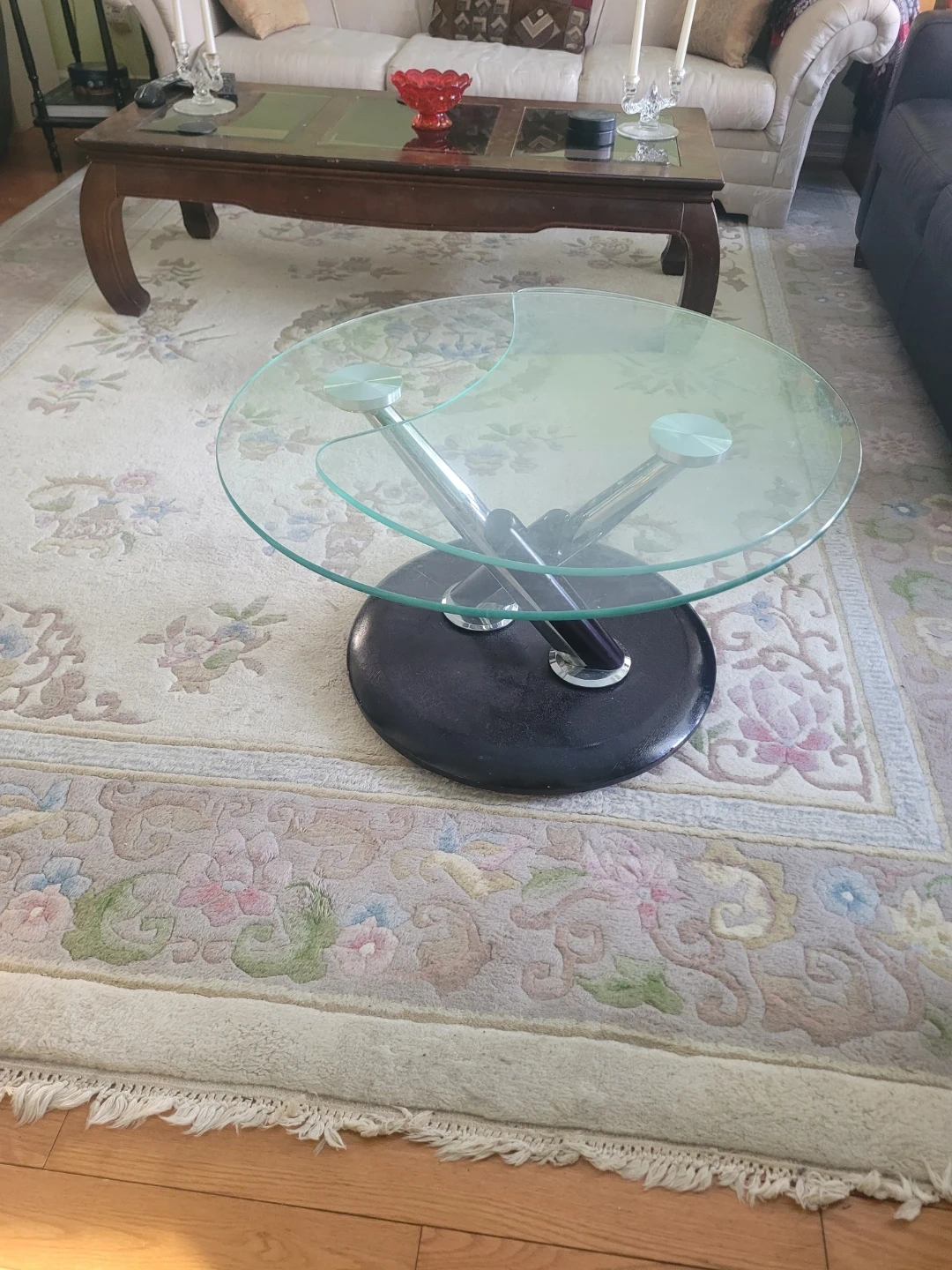 Selling a round glass coffee table with a black base. It rotates to make 2 different sizes. It's in great shape and would look lovely in any living room!