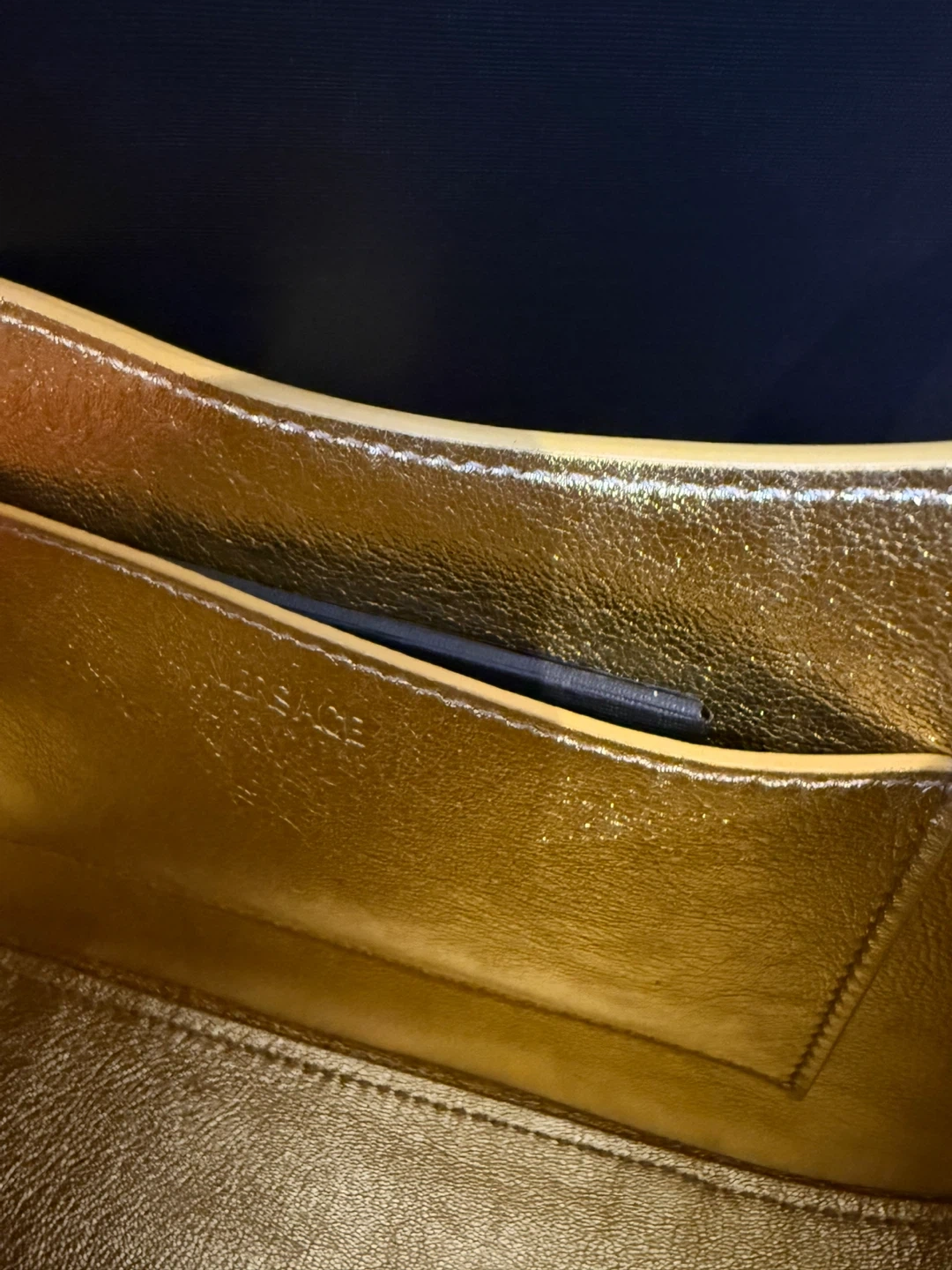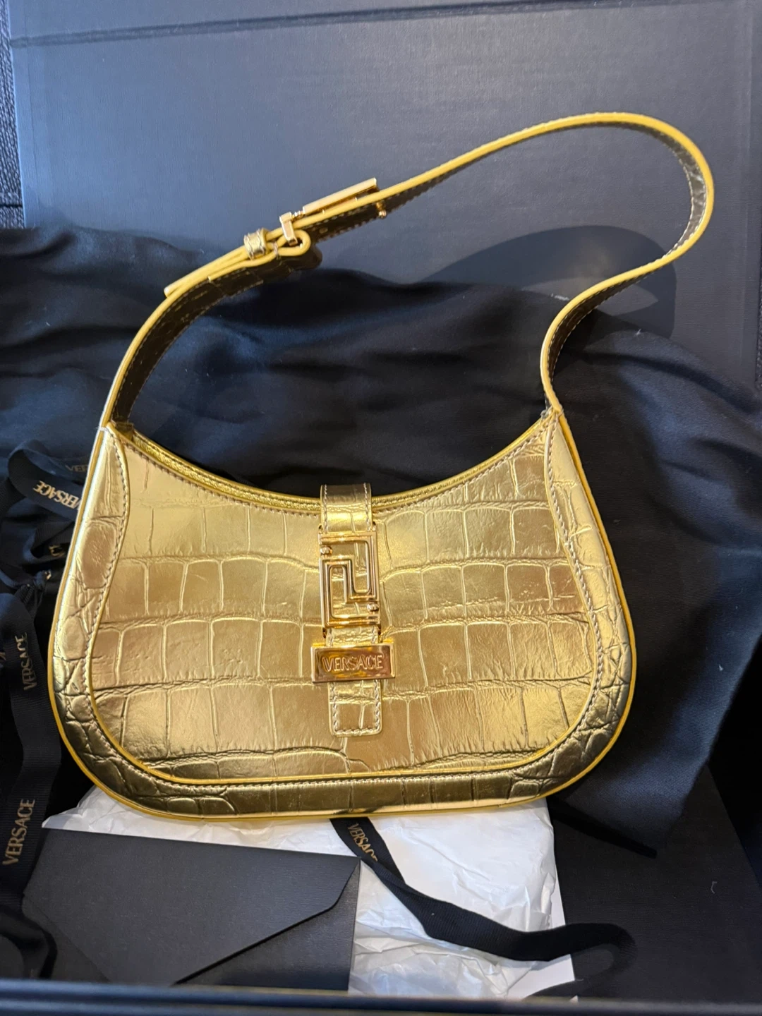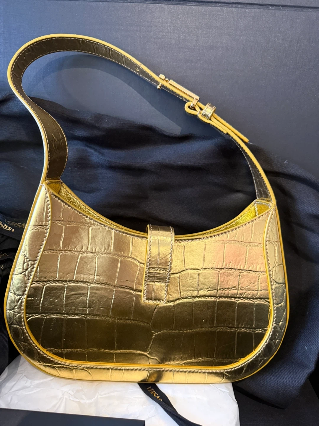 Selling a beautiful Versace shoulder bag in gold. It's in great condition and comes with the original box. This stylish bag is perfect for adding a touch of luxury to any outfit!
