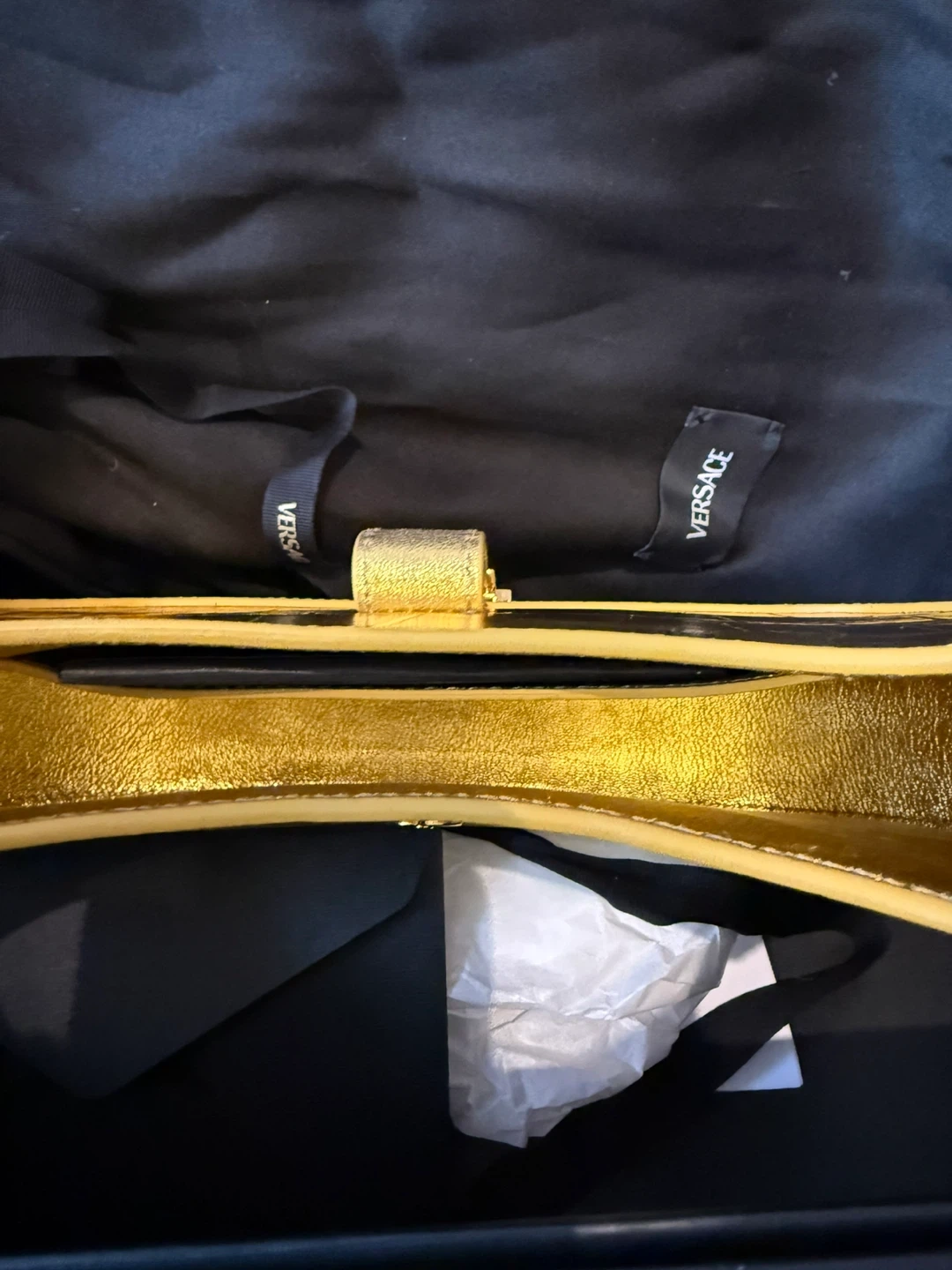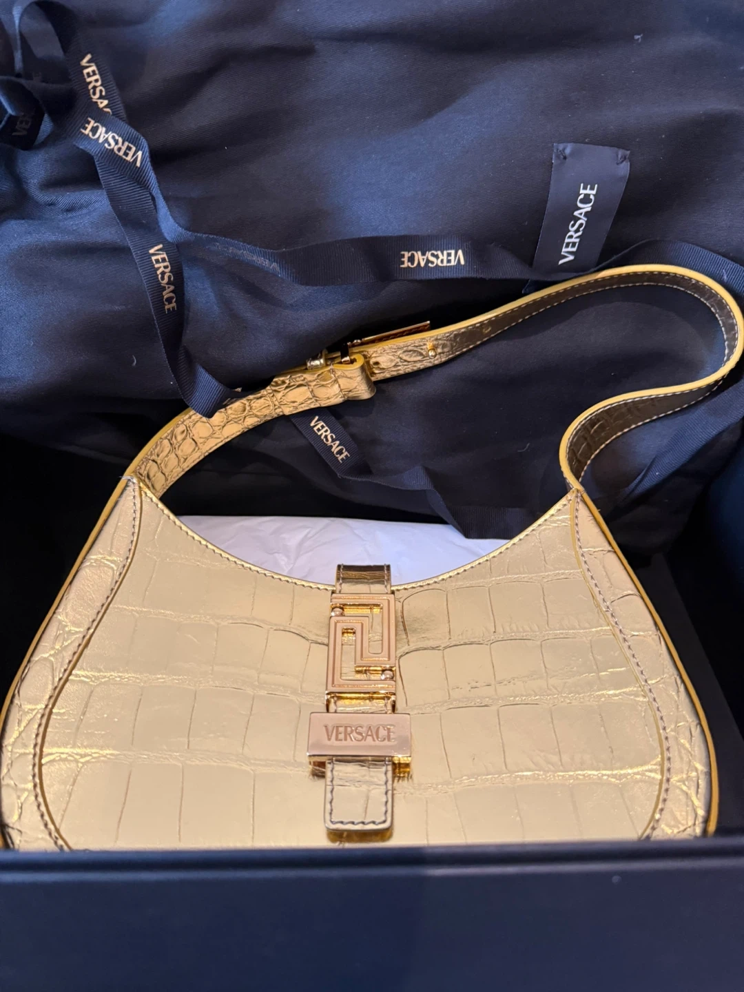 Selling a beautiful Versace shoulder bag in gold. It's in great condition and comes with the original box. This stylish bag is perfect for adding a touch of luxury to any outfit!