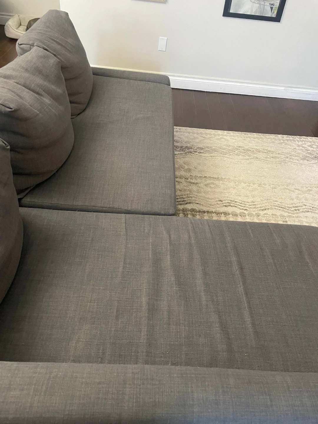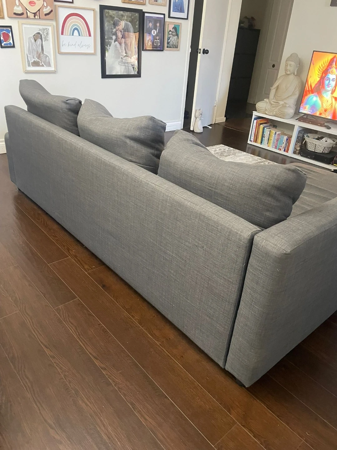 Selling a comfortable grey sectional sofa. It's in good condition and ready for a new living room! The sectional design offers plenty of seating space, perfect for lounging or entertaining guests. It features soft cushions for added comfort.