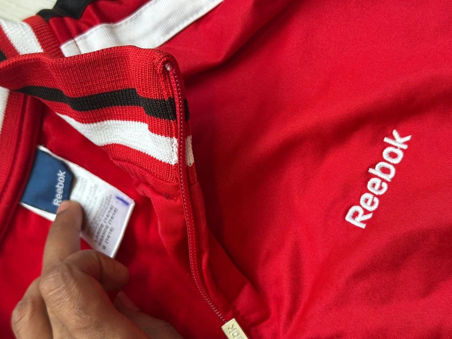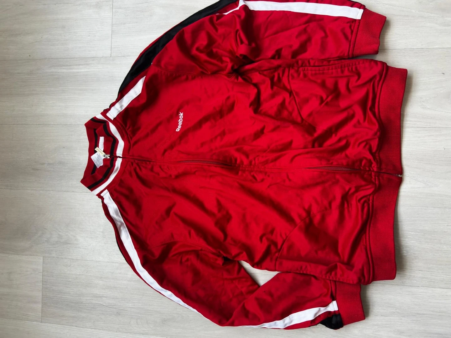 Selling a red Reebok track jacket in size large. It features white stripes on the sleeves and a full zip closure. Perfect for workouts or casual wear